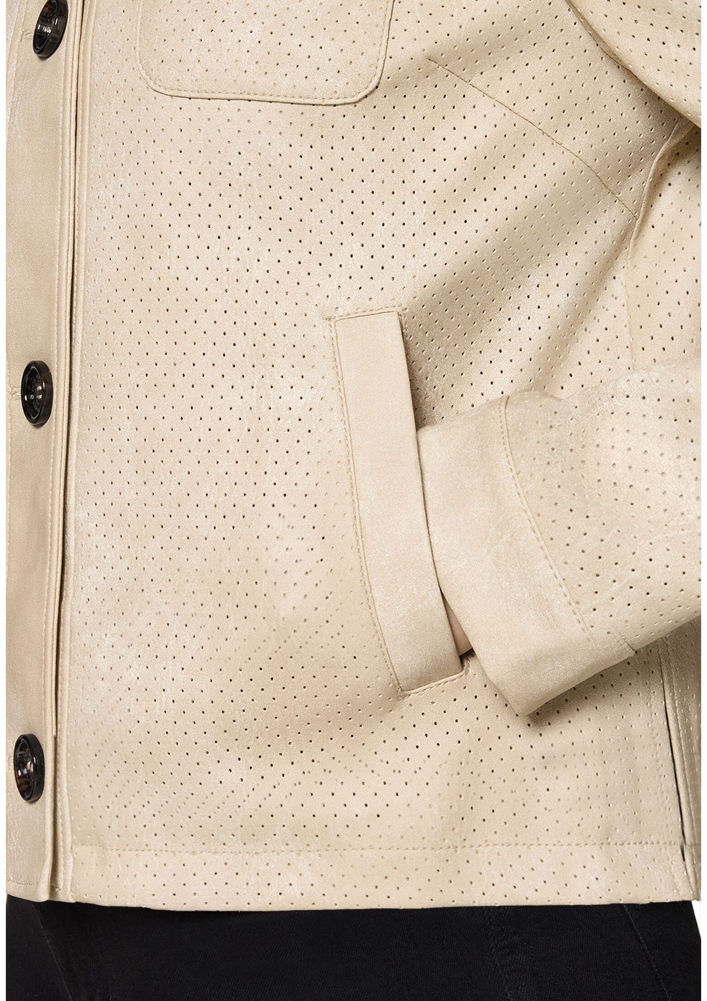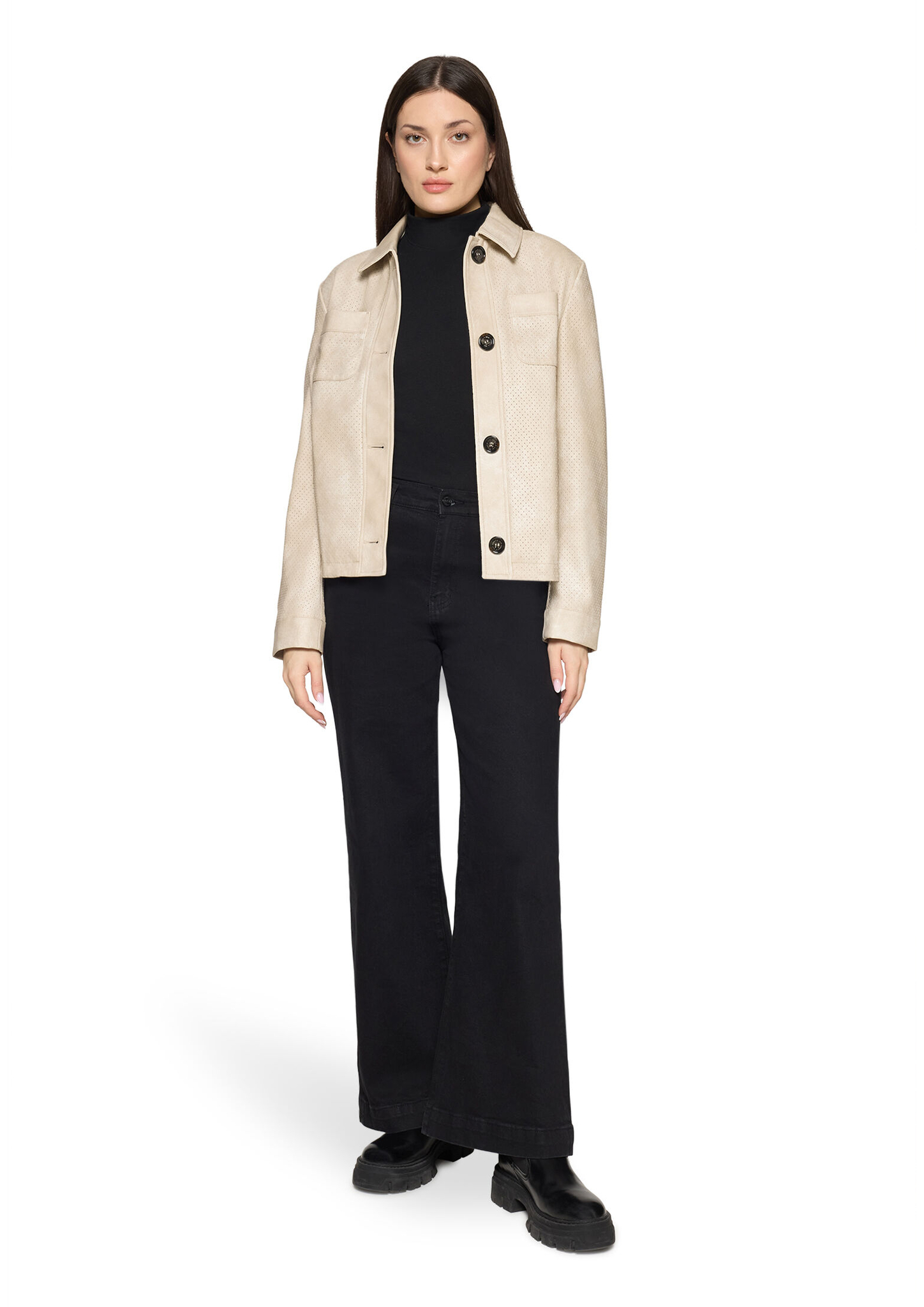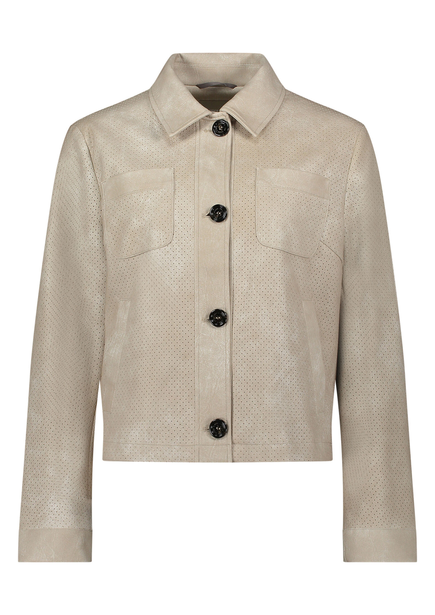 * Passform: Gerade * Gesamtlänge: 55 cm * Ärmellänge: Langarm * Kragenform: Umlegekragen * Materialart: Kunstleder * Tasche: Aufgesetzte Taschen, Paspeltasche * Verschluss: Knopfleiste * Muster: Uni * Futter: 100% Polyester