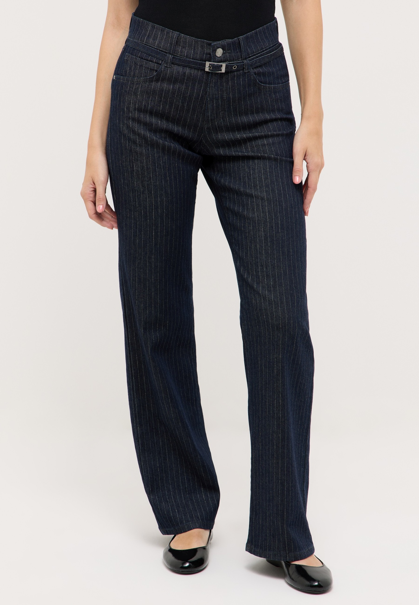 Die Liz Belt ist eine Wide-Leg-Jeans im entspannten Relaxed Fit, die mit modernem Design und höchstem Komfort überzeugt. Das feine Nadelstreifen-Dessin verleiht ihr einen eleganten, zugleich zeitlosen Look.