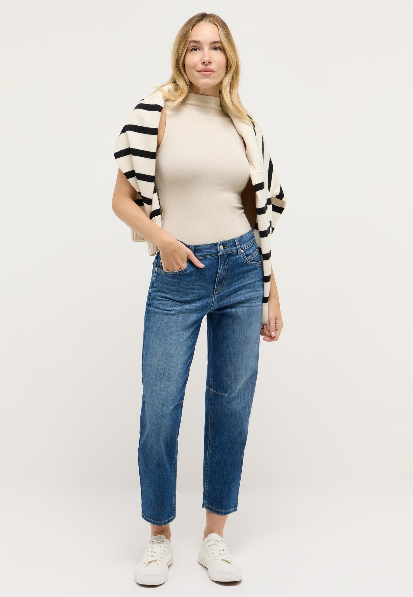 Mit der Evy bekommst du eine moderne Jeans mit verkürzter Länge und leicht verkürztem, geradem Bein. Ihr cleaner Look macht sie zu einem echten Allrounder, den du easy kombinieren kannst.