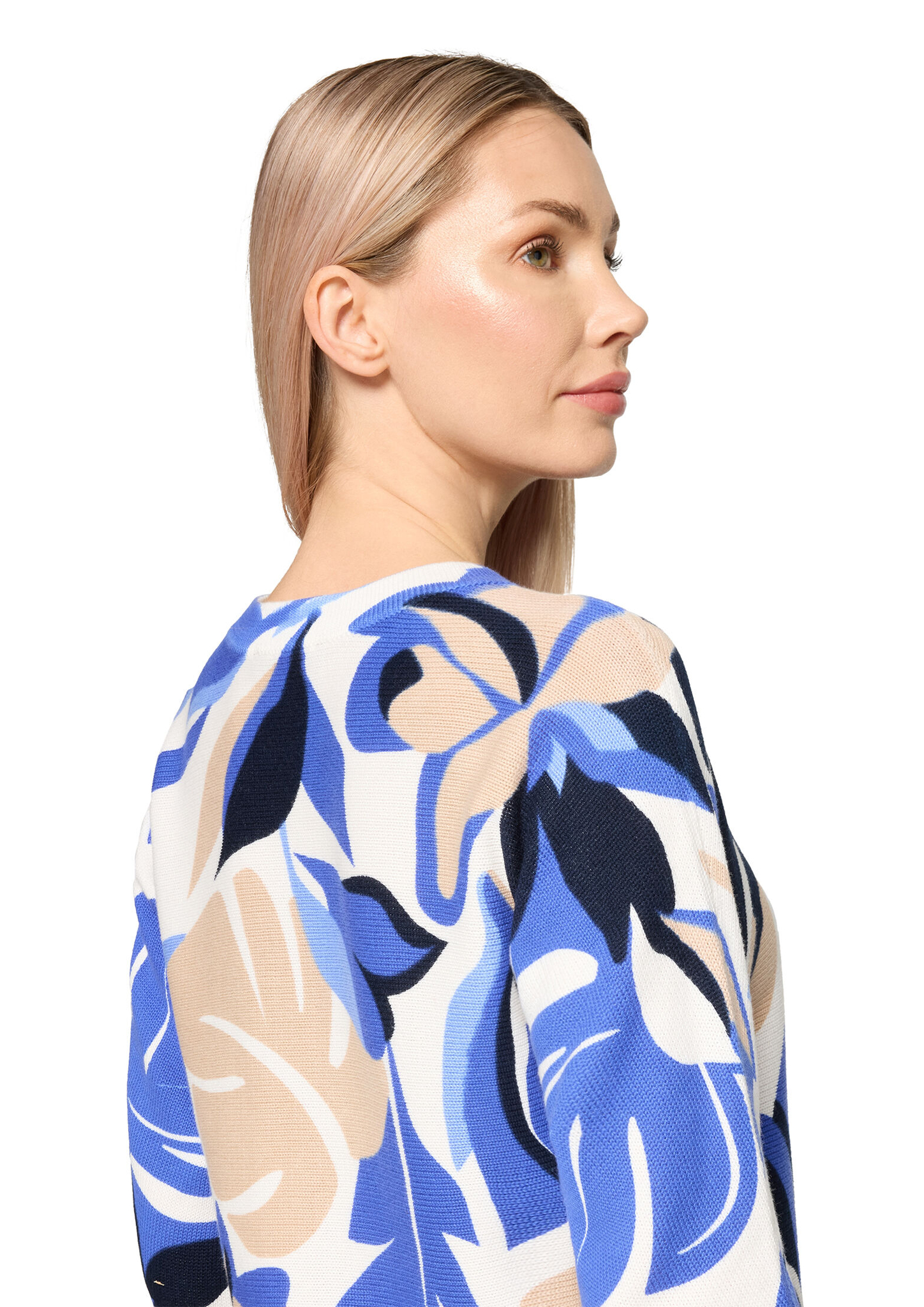 * Passform: Figurumspielend * Gesamtlänge: 58 cm * Ärmelform: Fledermausärmel * Ärmellänge: 3/4 Arm * Ausschnittform: Rundhals-Ausschnitt * Materialart: Strick * Muster: Floral / Blumen