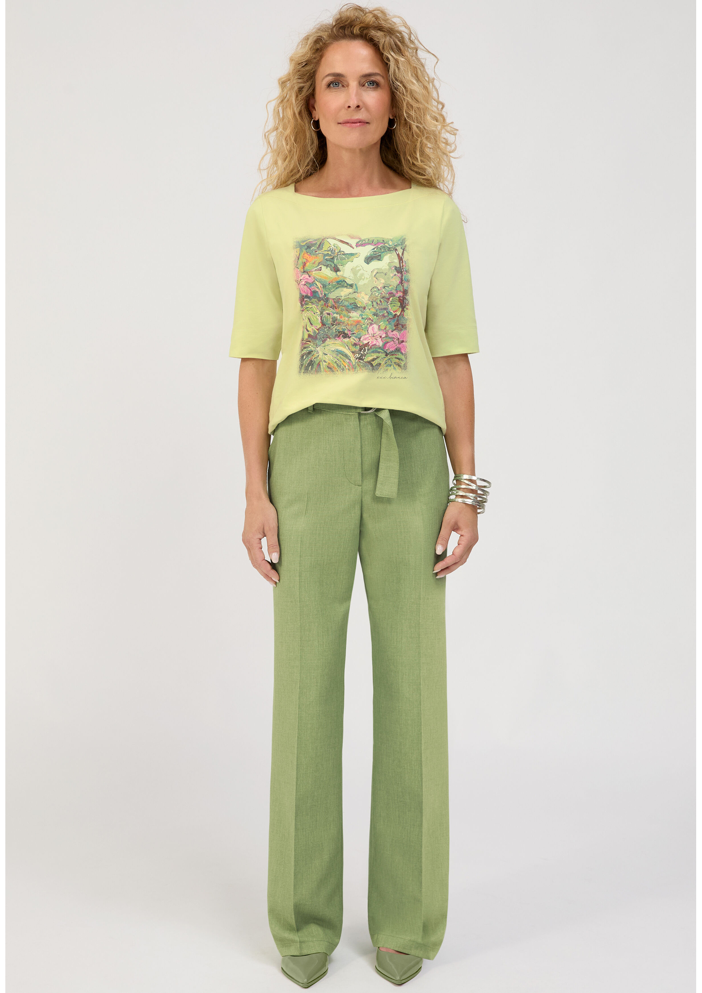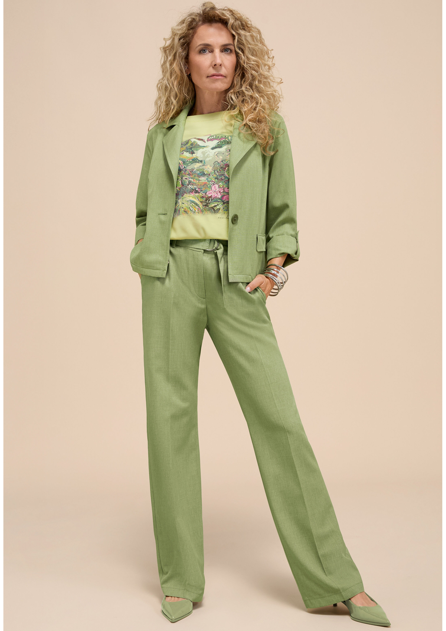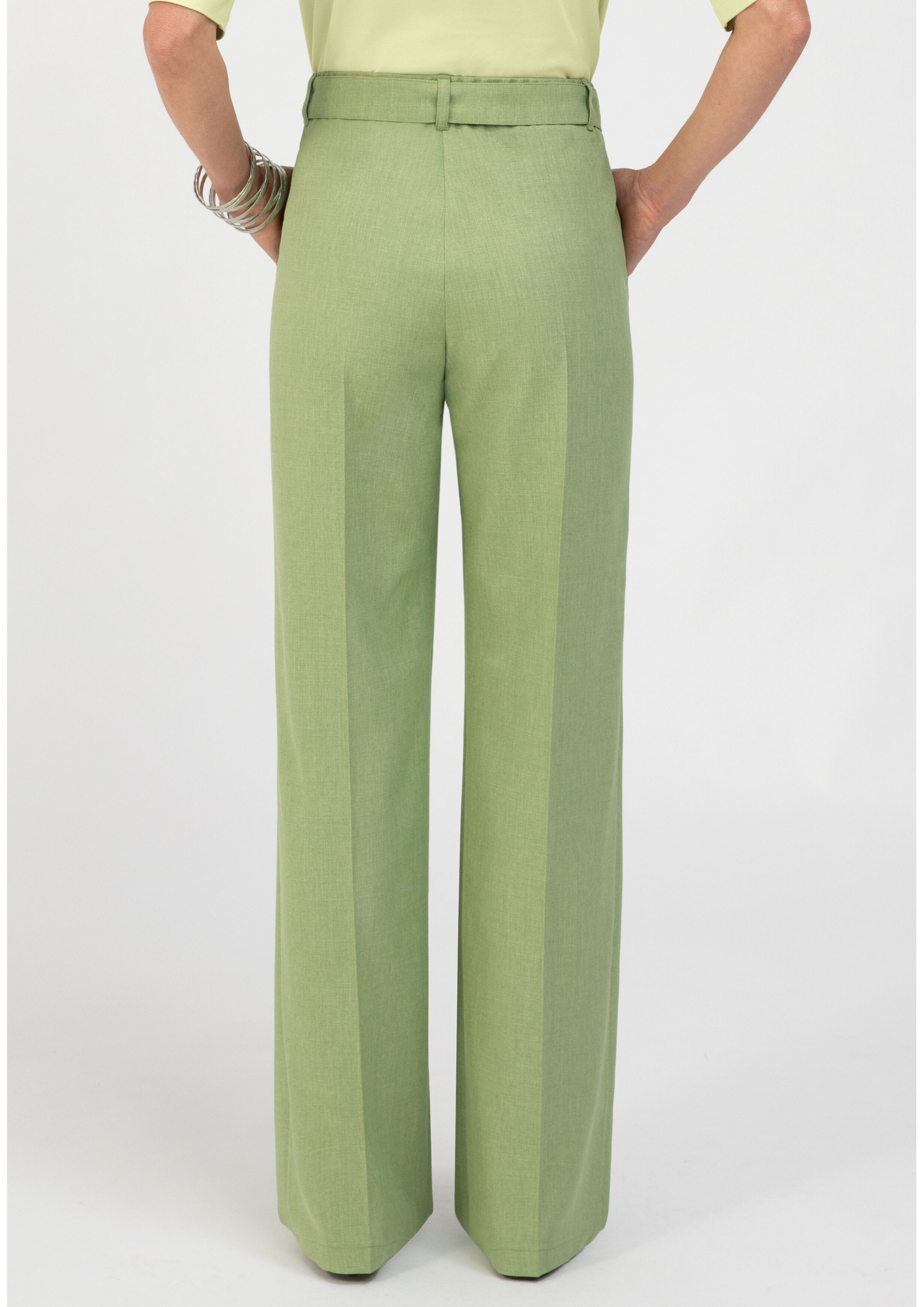 Ein echter Hingucker in der Trendfarbe "Pistachio Melange"! Unsere neue Stoffhose Parigi überzeugt mit moderner Silhouette und hohem Tragekomfort. Der elastische Bund hinten sorgt für eine optimale Passform, während ein Stoffgürtel und seitliche Eingrifftaschen stilvolle Akzente setzen. Die hochwertige, pflegeleichte Qualität und die lange, weite Passform machen sie zum vielseitigen Styling-Partner. In Kombination mit dem passenden Kurzblazer entsteht ein souveräner Look mit Statement! Diese Hose fällt klein aus, bitte wählen Sie eine Nummer größer.