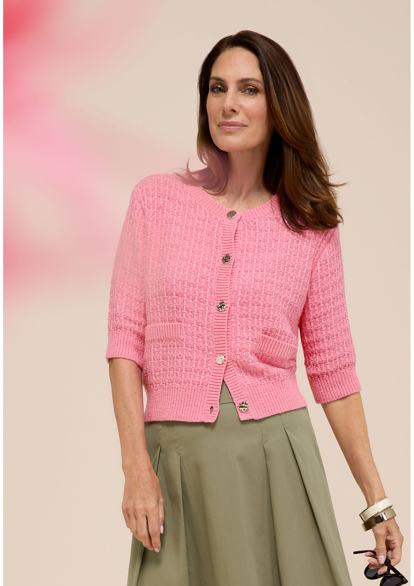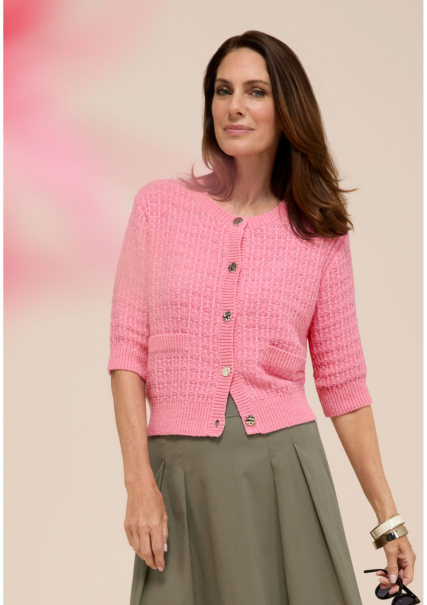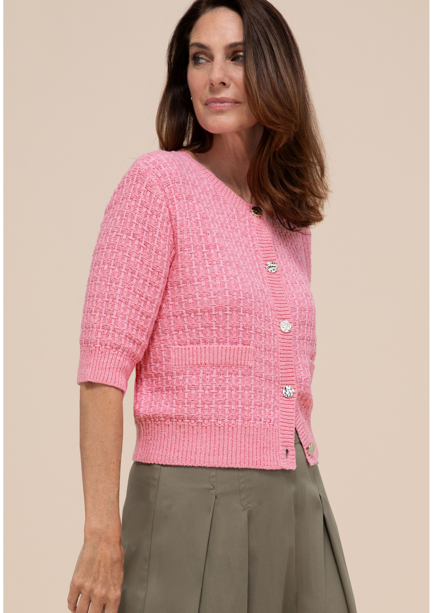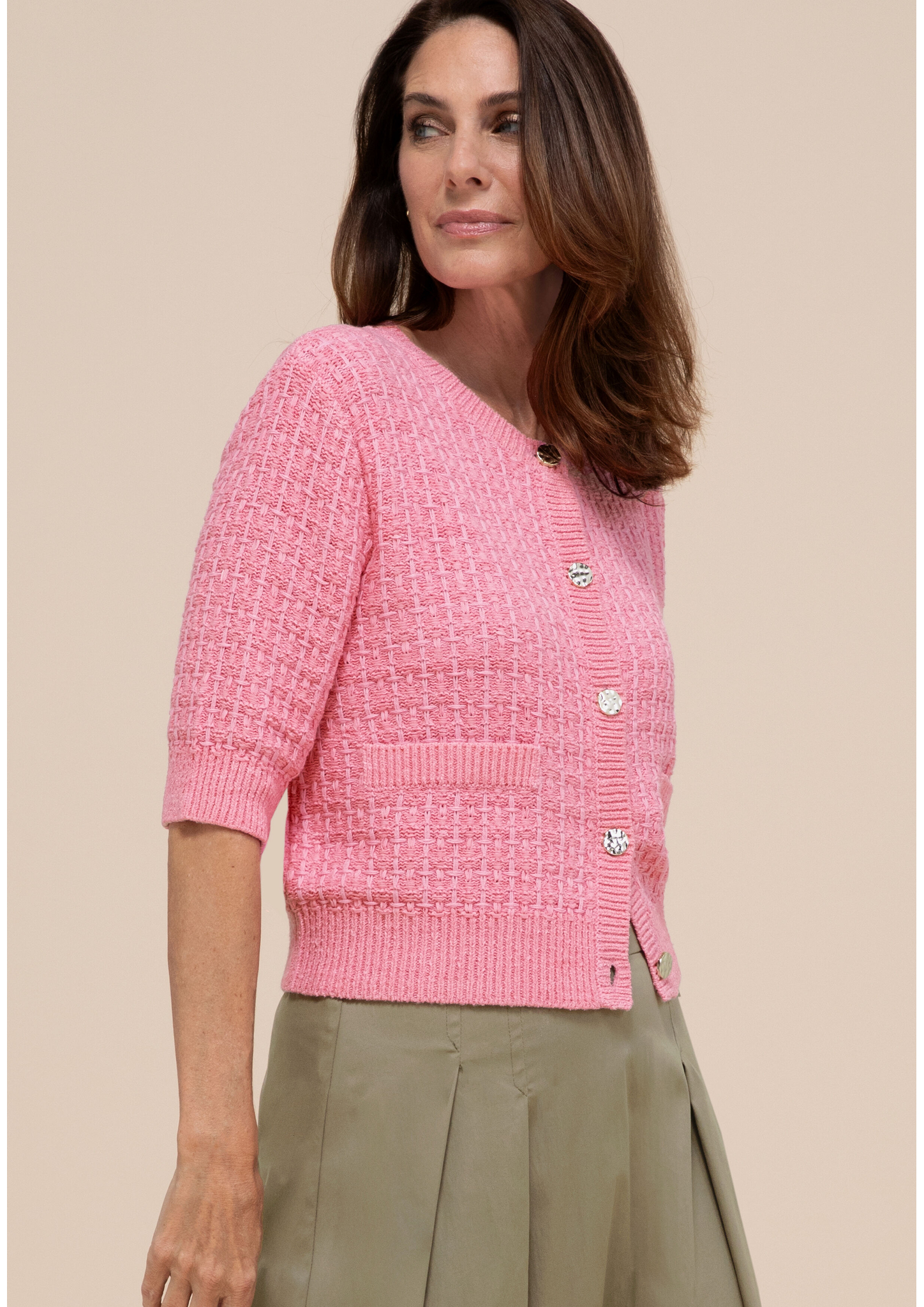 - * Feminine Strickjacke mit Kurzarm, moderne Stricktechnik * Hochwertiger und weicher Materialmix mit Baumwolle * Mit Rundhalsauschnitt und edler Knopfleiste * Gerade, lockere Passform * Bei Gr. 38: Länge ca. 53cm