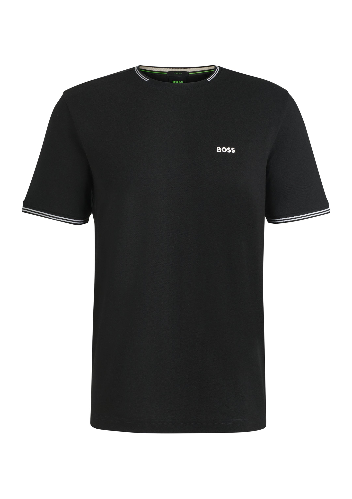 Gerade geschnittenes BOSS T-Shirt. Das Top aus softem Stretch-Baumwoll-Piqué ist mit kontrastfarbenen Streifen und einem Branding versehen.