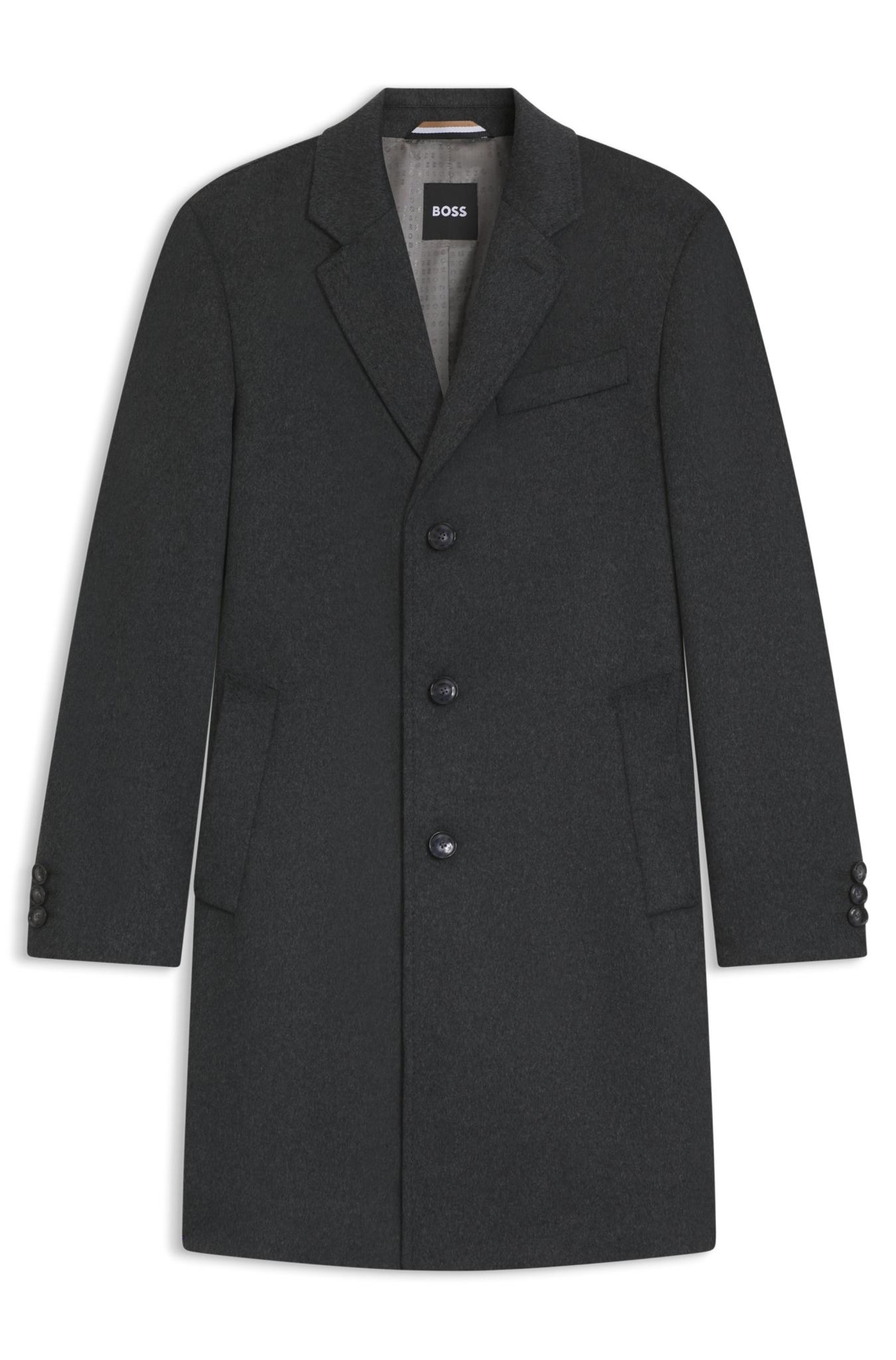 Der zeitlose BOSS Mantel aus einem soften Woll-Mix mit edlem Kaschmir-Anteil ist die ideale Wahl für formelle Layering-Looks. Schmale Passform. Fallendes Revers.