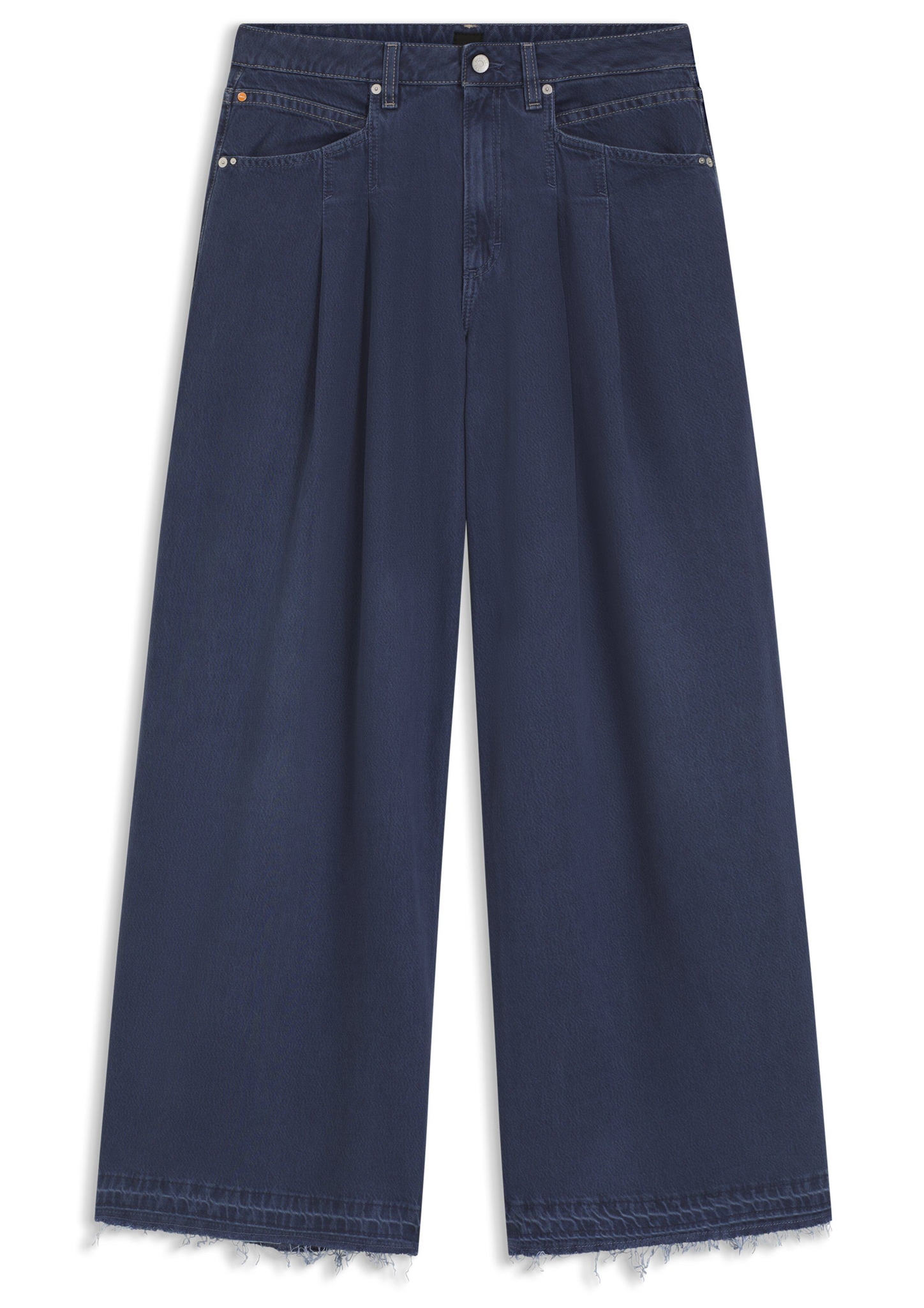 Die BOSS Jeans mit lockerer Passform, weitem Beinverlauf und Bundfalten auf der Vorderseite sorgt für eine progressive Silhouette. Rauchblauer Denim in Marmor-Optik.