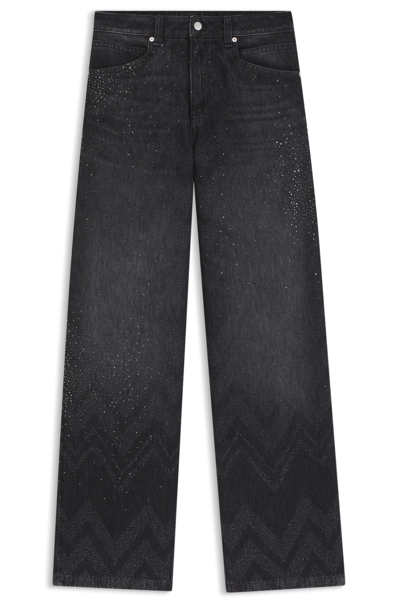 Die BOSS Jeans aus schwarzem Denim mit gelaserter Struktur und funkelnden Kristallen sorgt für einen lässigen Auftritt. Lockere Passform. Weiter Beinverlauf. Markante Taschen-Details.