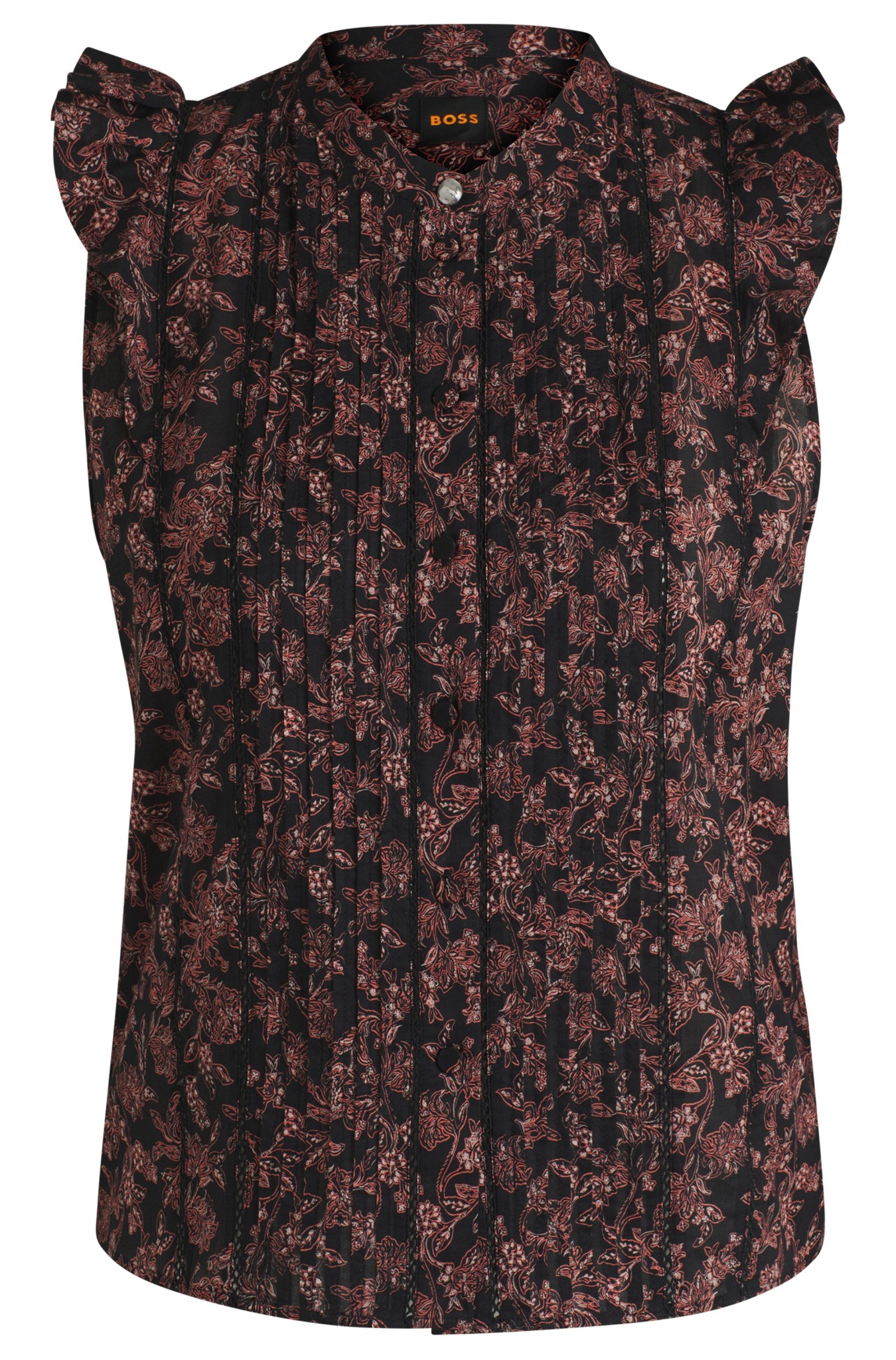 Die leichte BOSS Bluse ist mit einem eleganten Motiv bedruckt. Falten auf der Vorderseite verleihen ihr mehr Dimension. Feminine Flatterärmel. Metallknopf am Kragen. Dieses Produkt enthält mindestens 60 % bessere Rohstoffe. Dieses Produkt wird teilweise mit Bio-Baumwolle gefertigt. Unsere Bio-Standards erlauben keine Verwendung von synthetischen Düngemitteln, Pestiziden oder gentechnisch verändertem Saatgut.