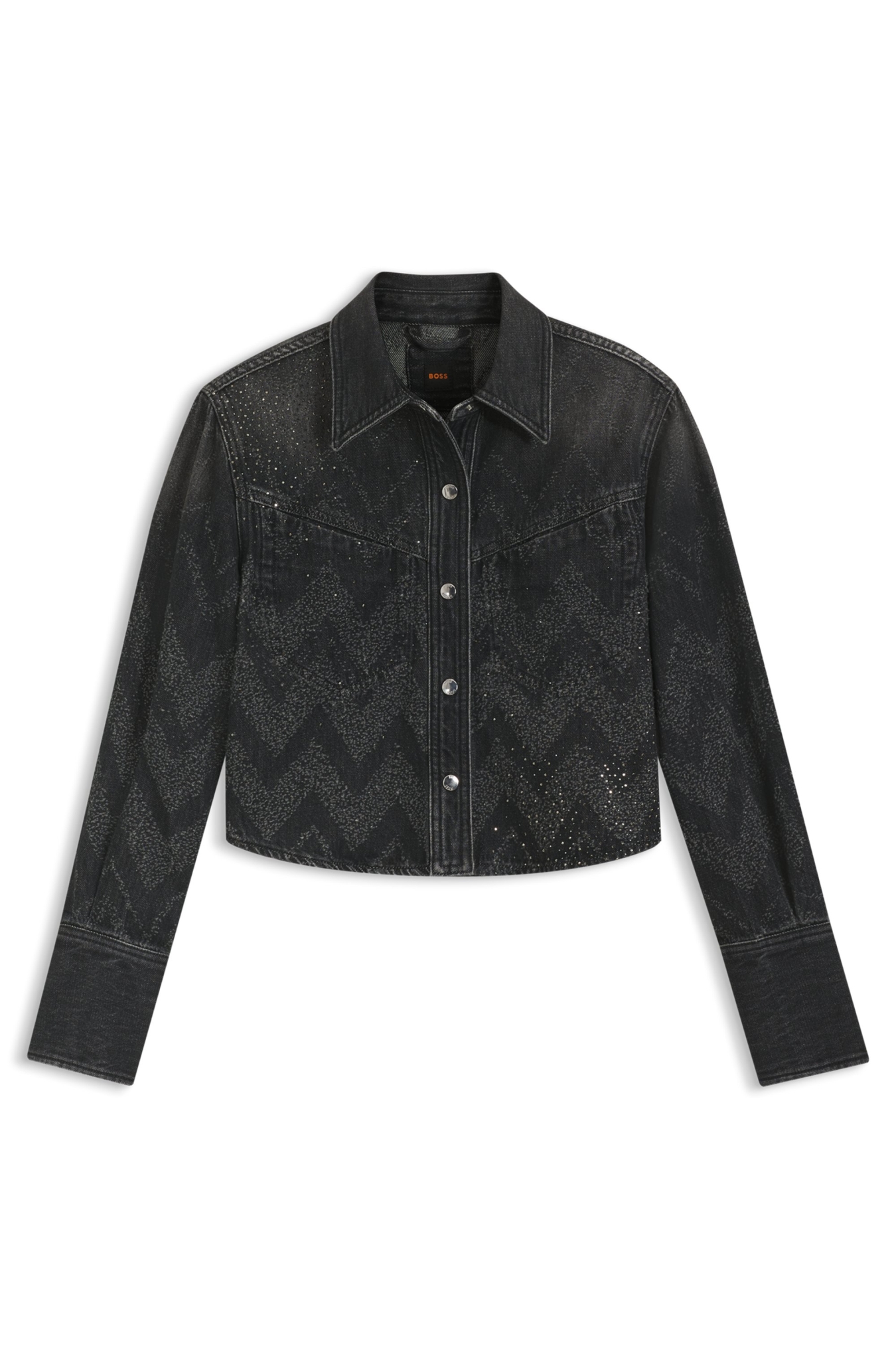 Die BOSS Bluse mit gelaserter Struktur und schimmernden Kristallen ist eine frische Neuinterpretation eines legeren Essentials. Fester Denim in Schwarz. Cropped-Länge.