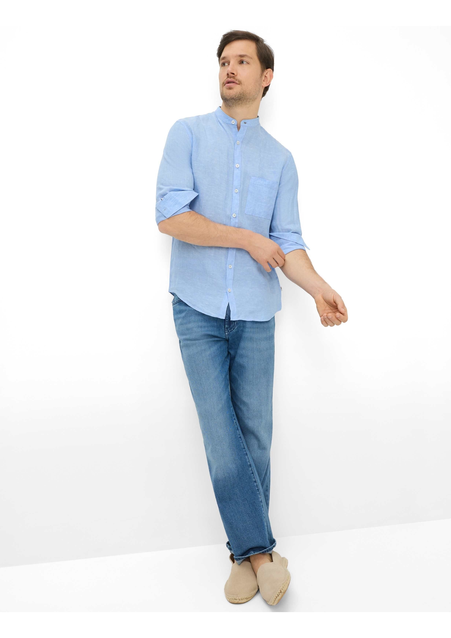 Lässig, leicht und mit maskuliner Klarheit – das Herrenhemd im STYLE LARS ist wie gemacht für die warmen Tage des Jahres. Der leicht taillierte Schnitt mit modernem Stehkragen und durchgehender Knopfleiste sorgt für eine geradlinige, markante Silhouette. Die aufgesetzte Brusttasche betont den authentischen Charakter des Hemds, die schmalen Manschetten an den Ärmeln verleihen ihm Struktur und Stil. Gefertigt aus reinem Leinen, steht dieses Hemd für natürliche Leichtigkeit und hohen Tragekomfort – kühlend, atmungsaktiv und angenehm auf der Haut. Ob offen über einem T-Shirt getragen oder solo zur Chino – STYLE LARS ist der perfekte Begleiter für einen souveränen, sommerlich-lässigen Look.
