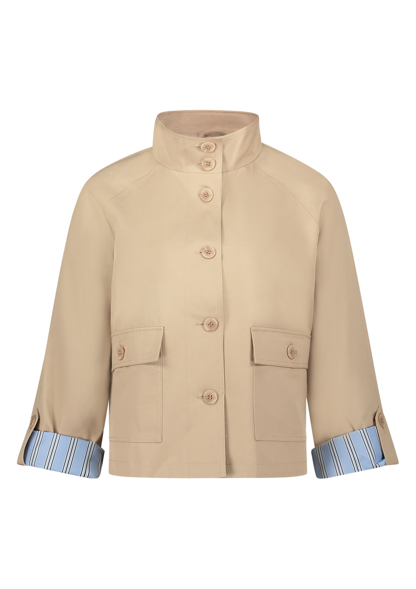 * Passform: A-Linie * Gesamtlänge: 60 cm * Ärmelform: Raglanärmel * Ärmellänge: Langarm * Kragenform: Stehkragen * Tasche: Aufgesetzte Taschen * Verschluss: Knopfleiste * Muster: Uni