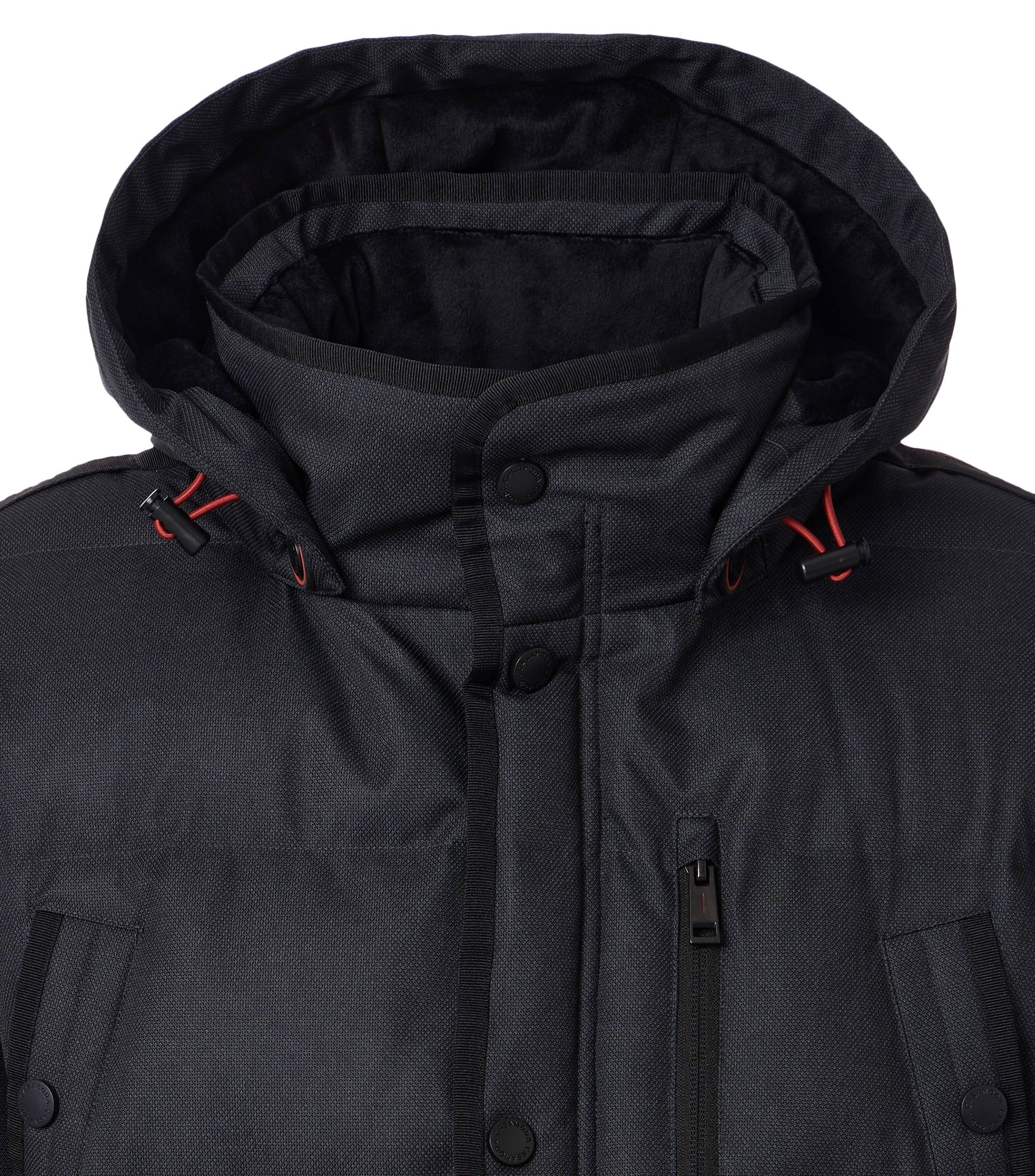 - Mit Kapuze und Felleinsatz am Kragen