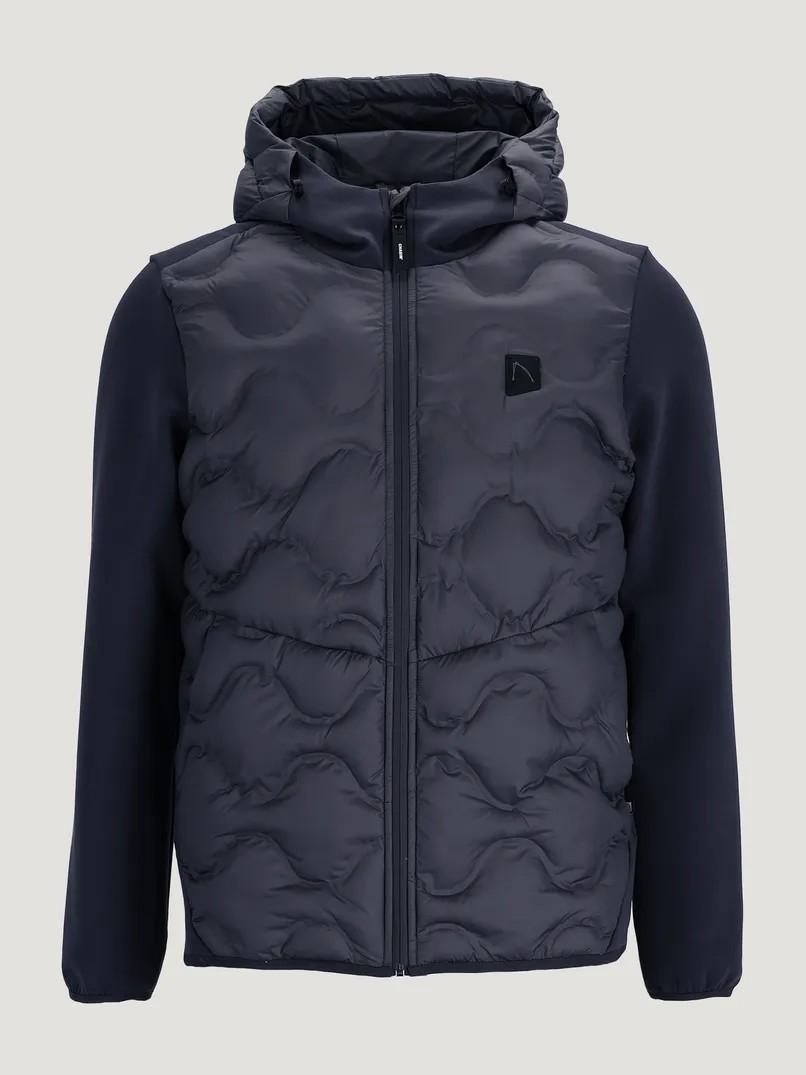 Die Theo Hybrid ist eine Regular-Fit-Jacke mit gestepptem Body sowie einfarbigem Rücken und Ärmeln. Leicht und wendbar – eine Seite clean, die andere mit Steppmuster. Mit tonalem Komma-Badge auf der Brust.