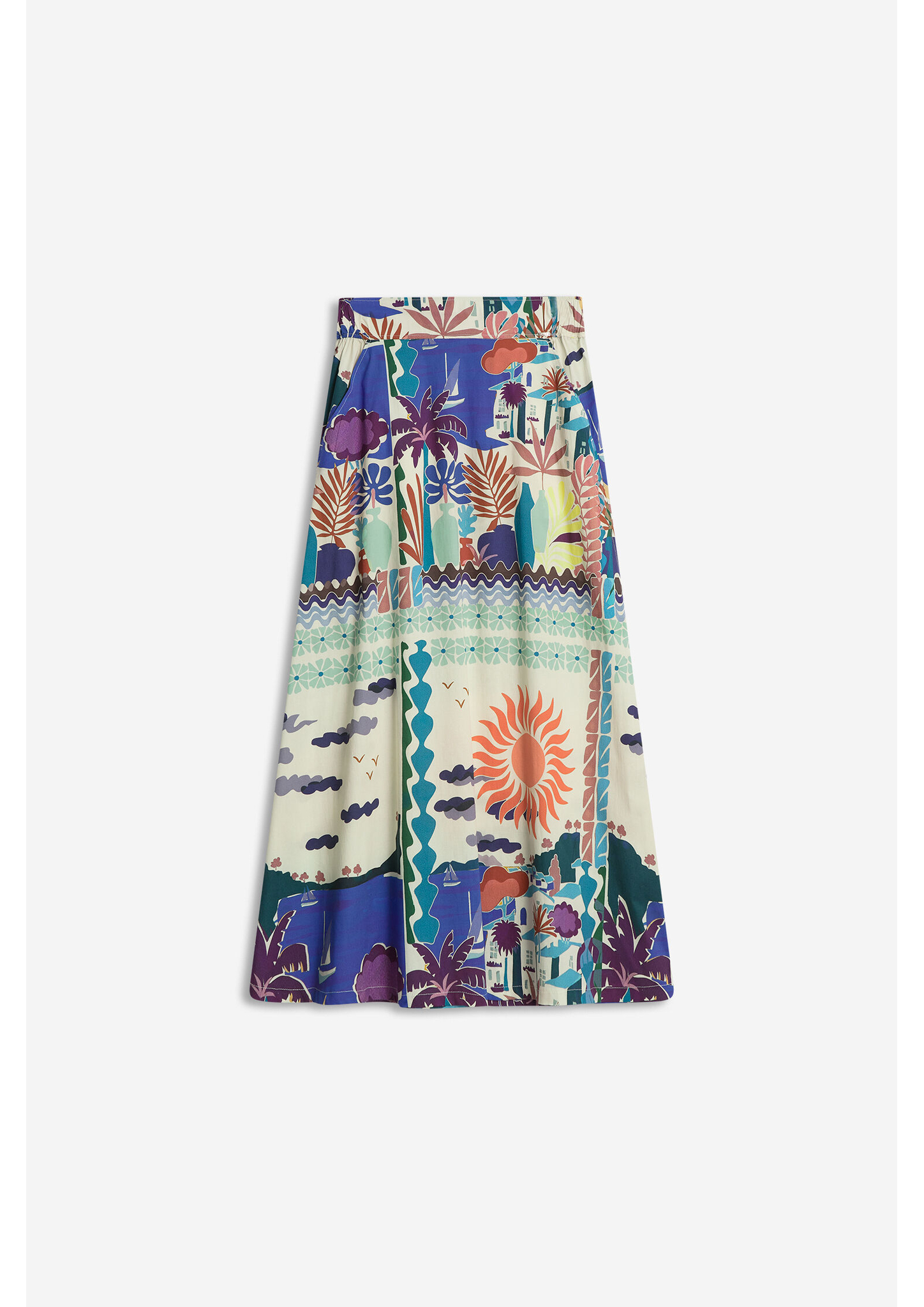 Femininer Midirock mit farbenfrohem Sommerprint. Der fließende Stoff und die sanfte Silhouette verleihen ihm Leichtigkeit und Eleganz perfekt für warme Tage und vielseitige Sommer-Looks.