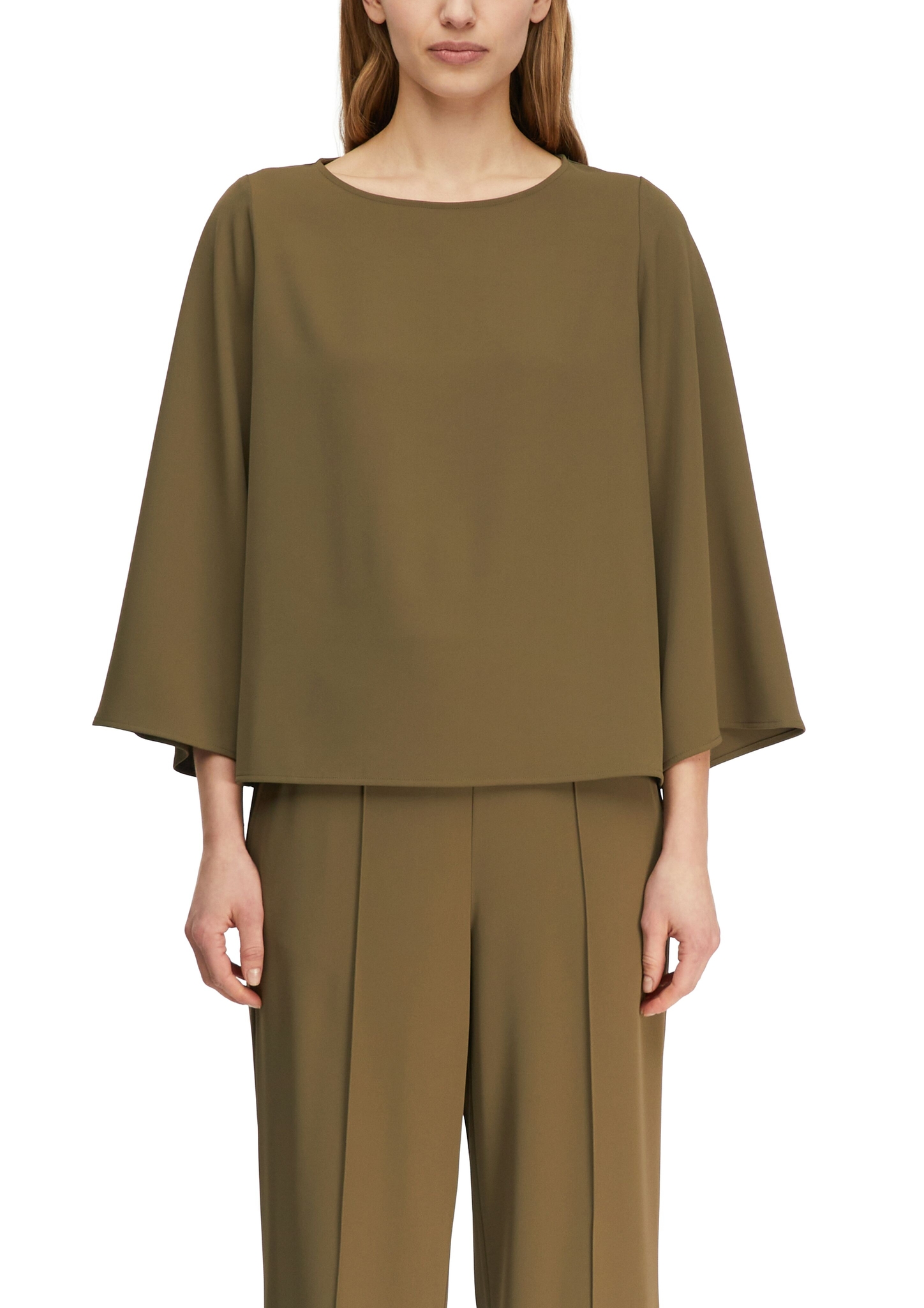 Entdecken Sie pure Eleganz mit dieser fließenden Bluse in Loose Fit. Die weiten 3/4-Ärmel in Cape-Optik setzen feminine Akzente, während der Crew Neck-Ausschnitt zeitlose Raffinesse verleiht. Seitliche Schlitze am geraden Saum sorgen für zusätzliche Bewegungsfreiheit. Das halblange Design aus geschmeidiger Travel Ware lässt sich mühelos mit einer schmalen Hose für den Business-Look oder lässig zur Jeans kombinieren. Perfekt für vielseitige Styling-Momente vom Büro bis zum Dinner.