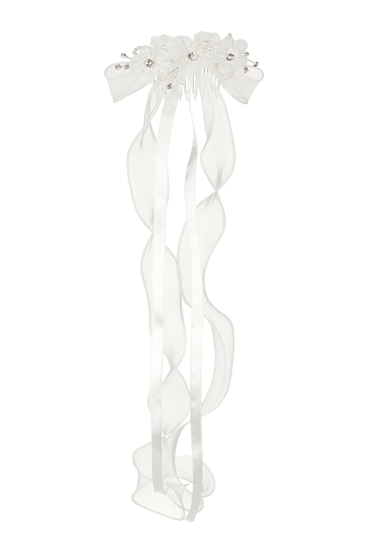 Haarschmuck mit zarten Blütenapplikationen und langen, weich fallenden Tüllbändern.