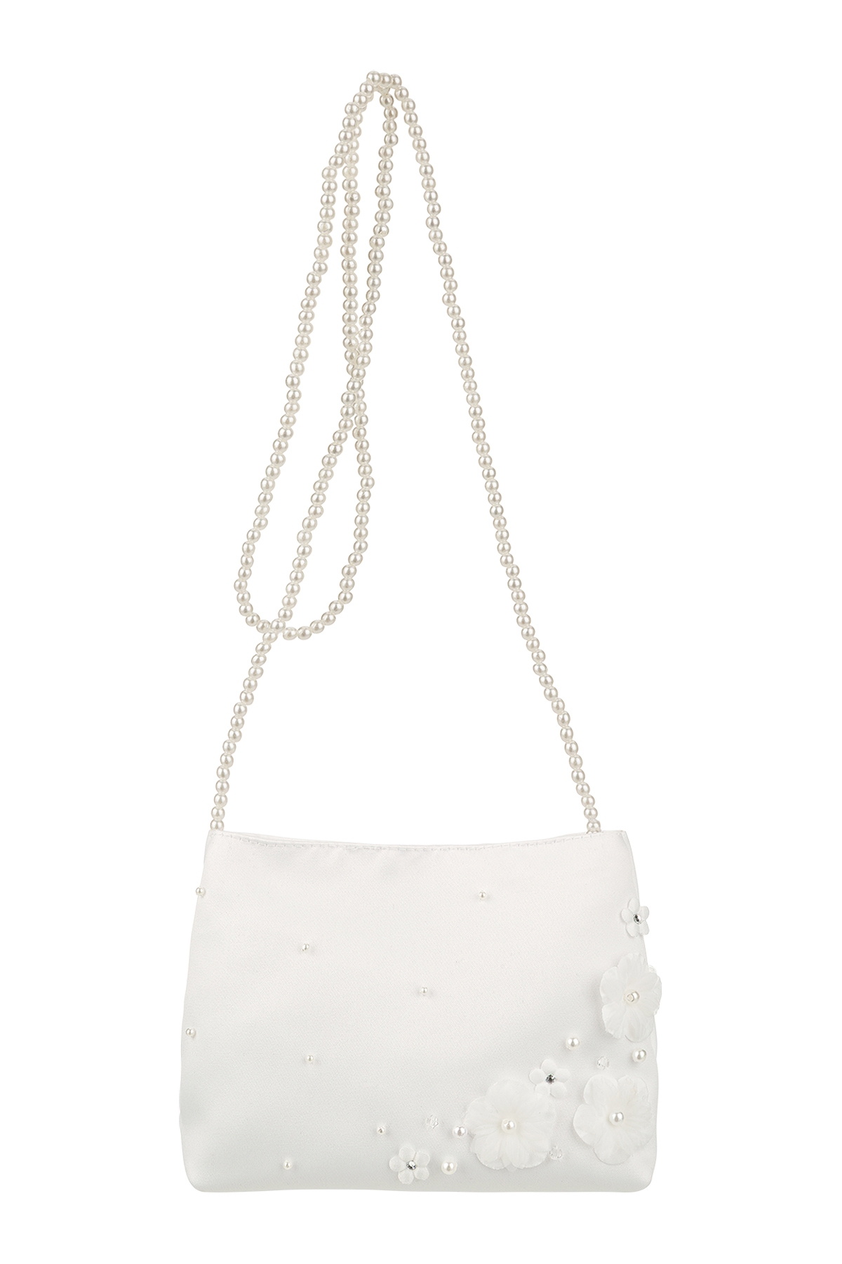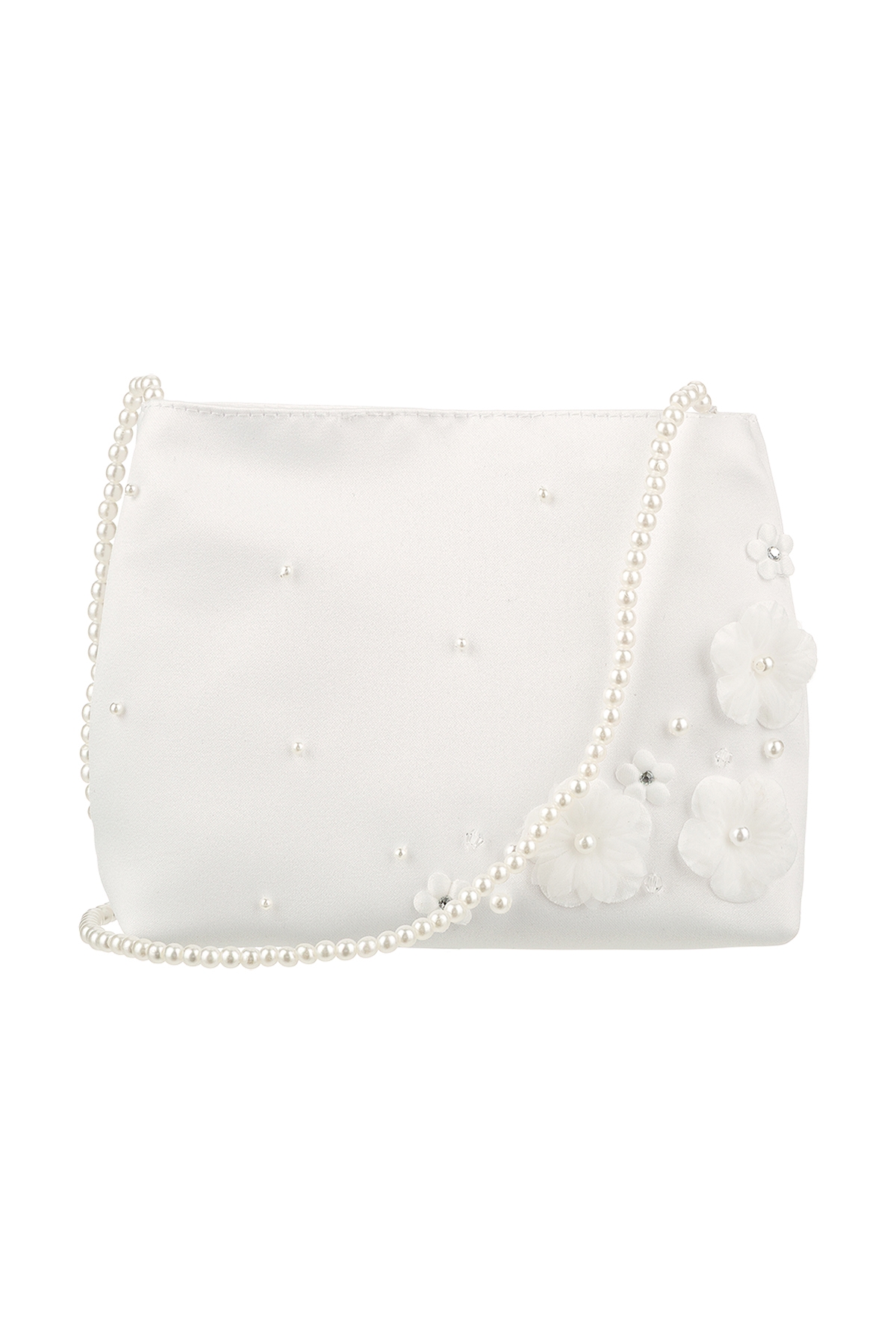 Kleine Tasche mit zarter Perlenkette und feinen Blumenapplikationen auf der Vorderseite.
