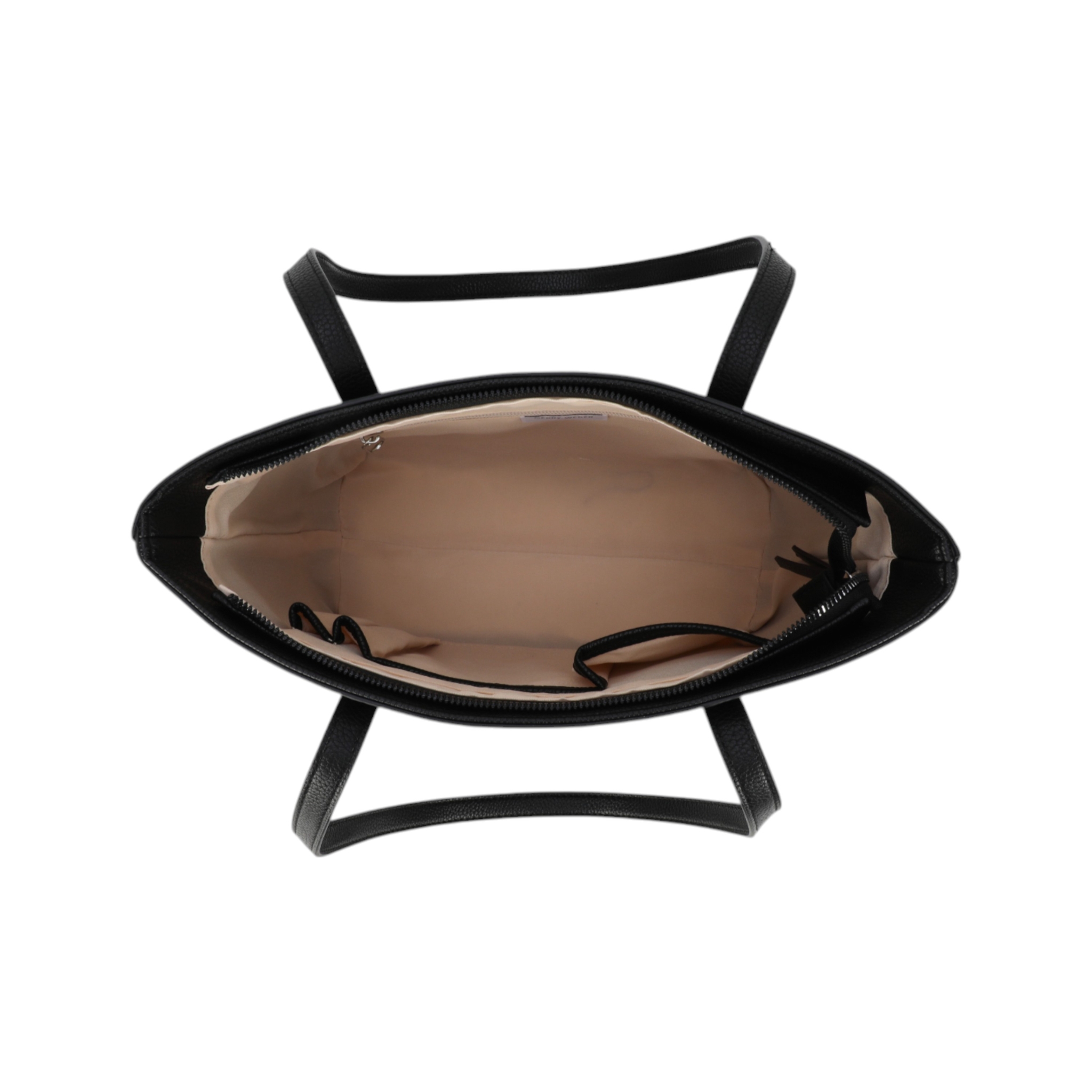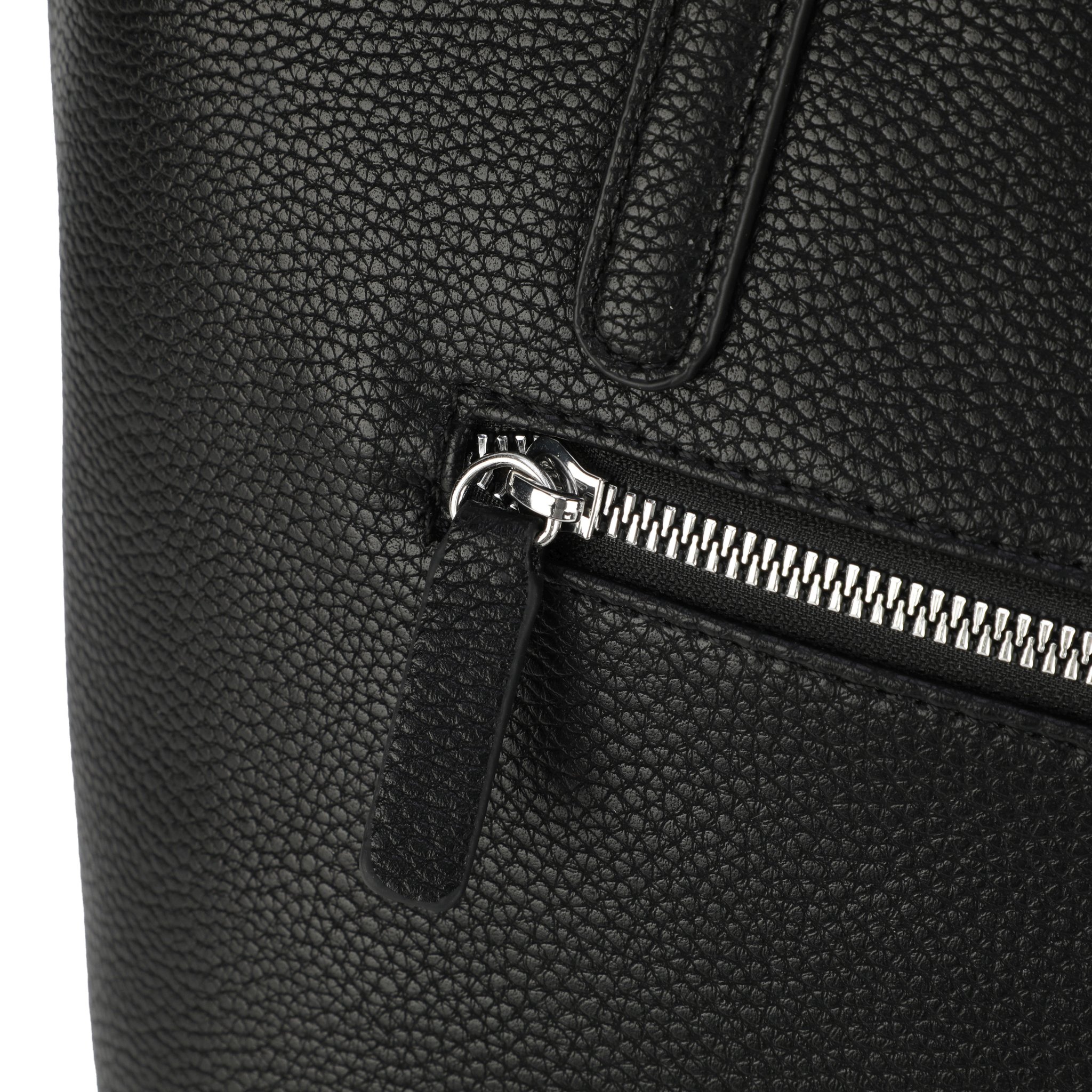- Außen: Obermaterial aus PU, schließt mit Reißverschluss, Henkel (Länge ca. 28 cm), Reißverschlussfach auf der Rückseite, Branding auf der Vorderseite