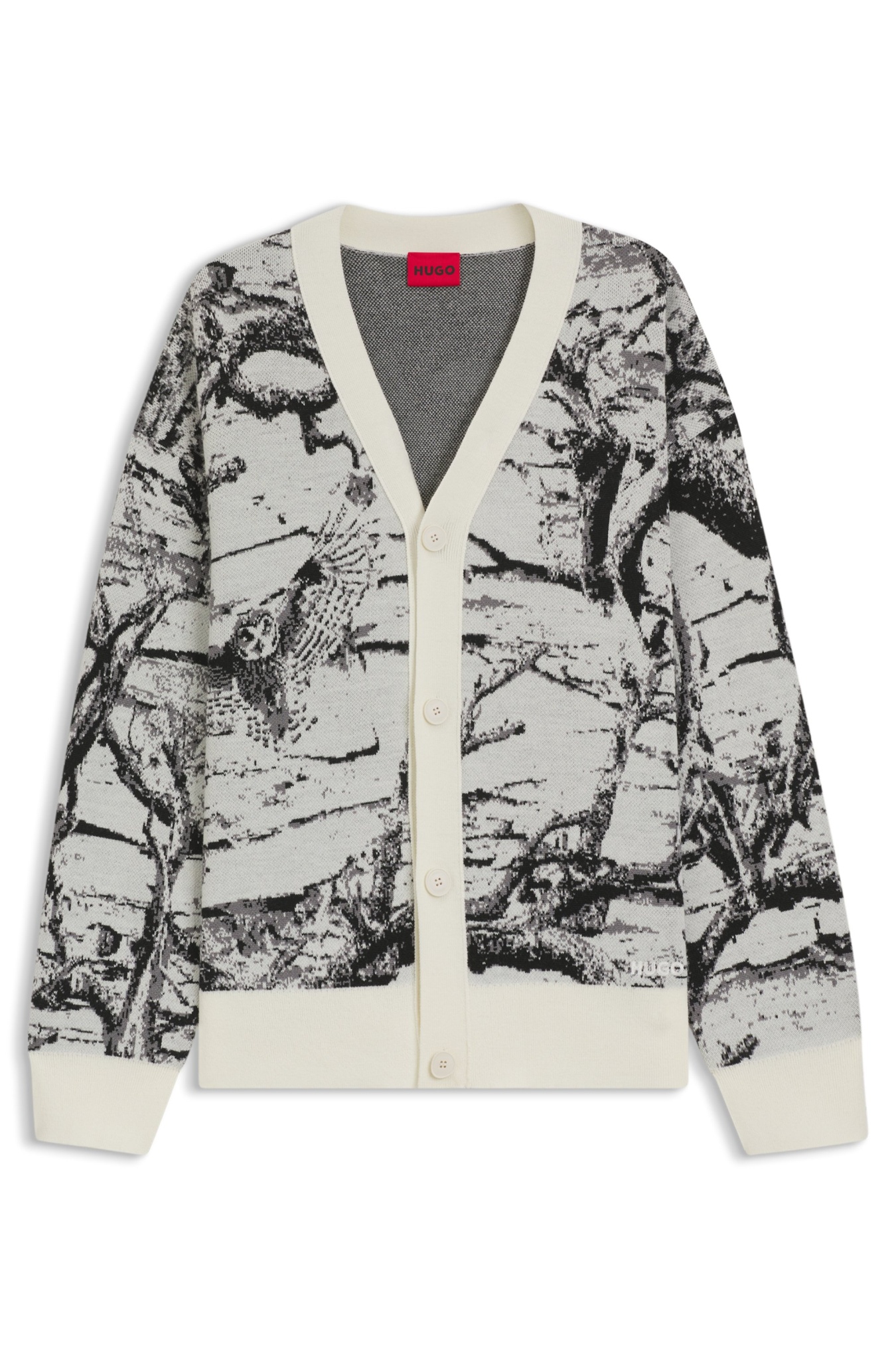 Das markante Jacquard-Muster und die Oversize-Passform der HUGO Strickjacke sorgen für ein Update bei deinen Layering-Looks. Logo-Stickerei. Material-Mix mit atmungsaktivem Woll-Anteil.