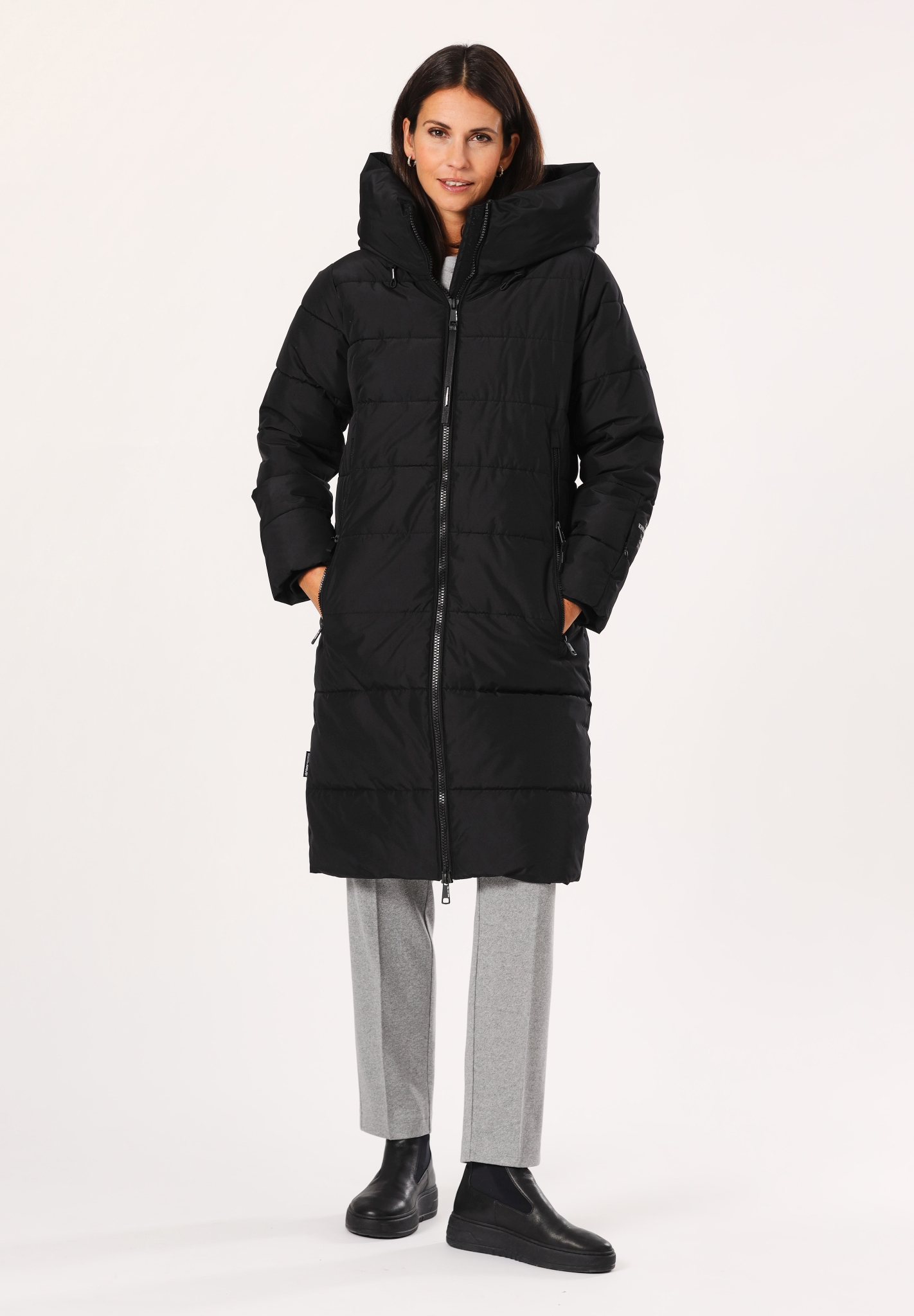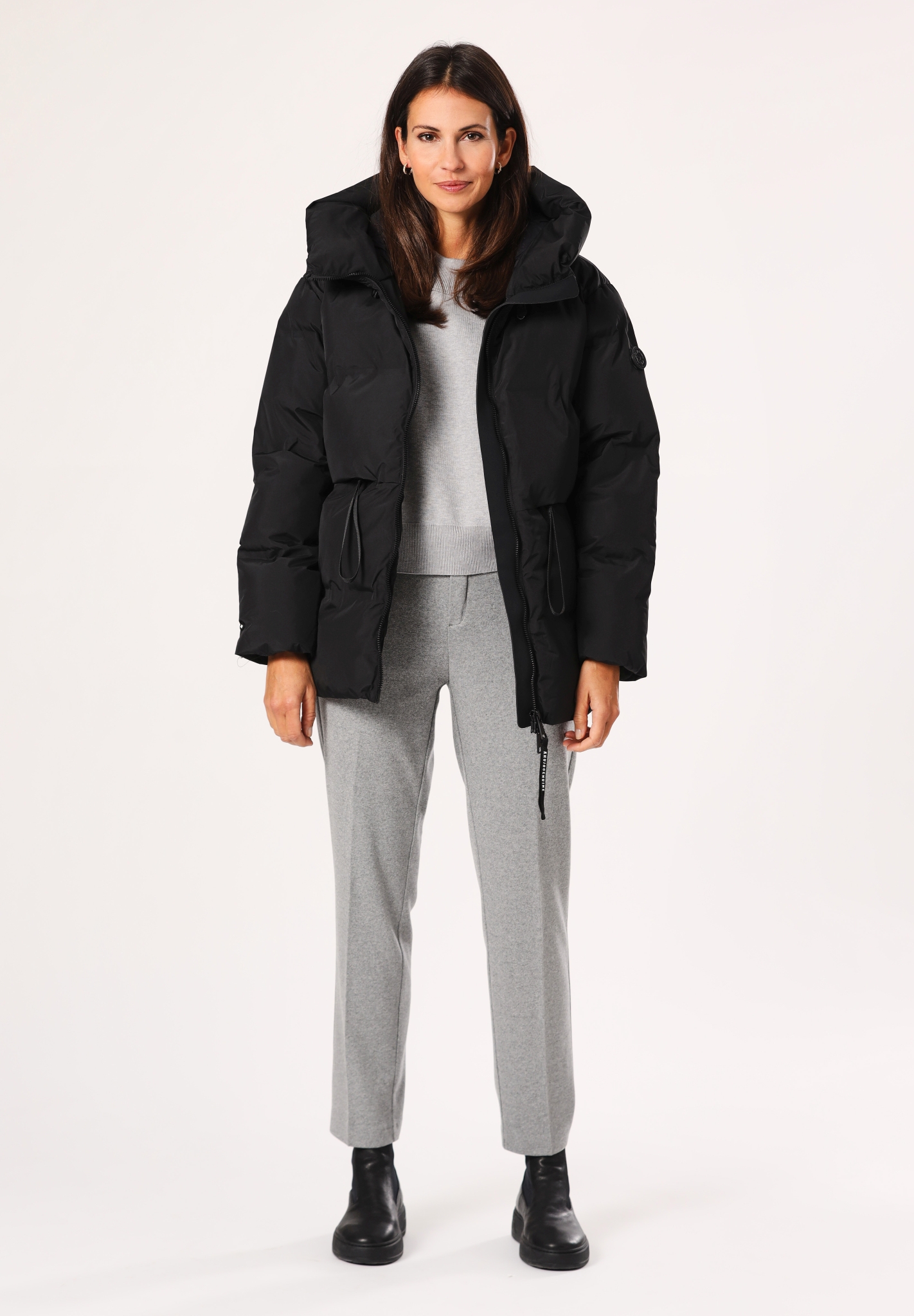 - hoch schließende Kapuze mit Kordelzug