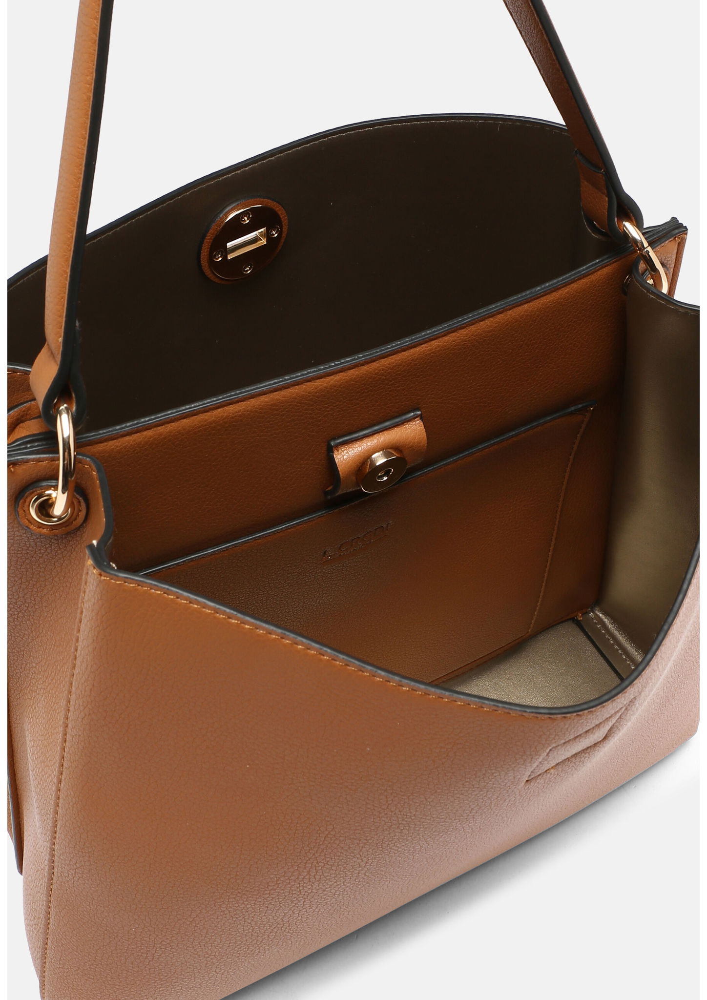 Shopper in stilvollem Design aus genarbtem Kunstleder mit Drehverschluss. Schlicht und elegant präsentiert sich der Shopper FILIPPA aus genarbtem Kunstleder. Mit seinem stilvollen Drehverschluss hat er ein individuelles Detail zu bieten, das direkt ins Auge fällt. Standfüßchen lassen die Tasche stabil stehen, wenn sie aus der Hand gelegt wird. Mit ihren zwei Fächern bietet sie Raum für eine optimale Organisation, innen hat sie zudem ein Steckfach für das Handy oder den Schlüssel.