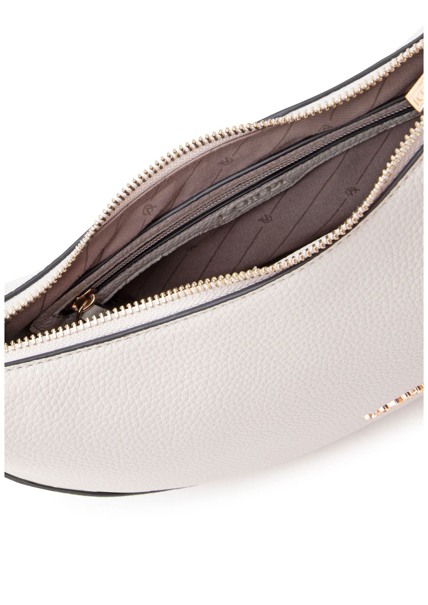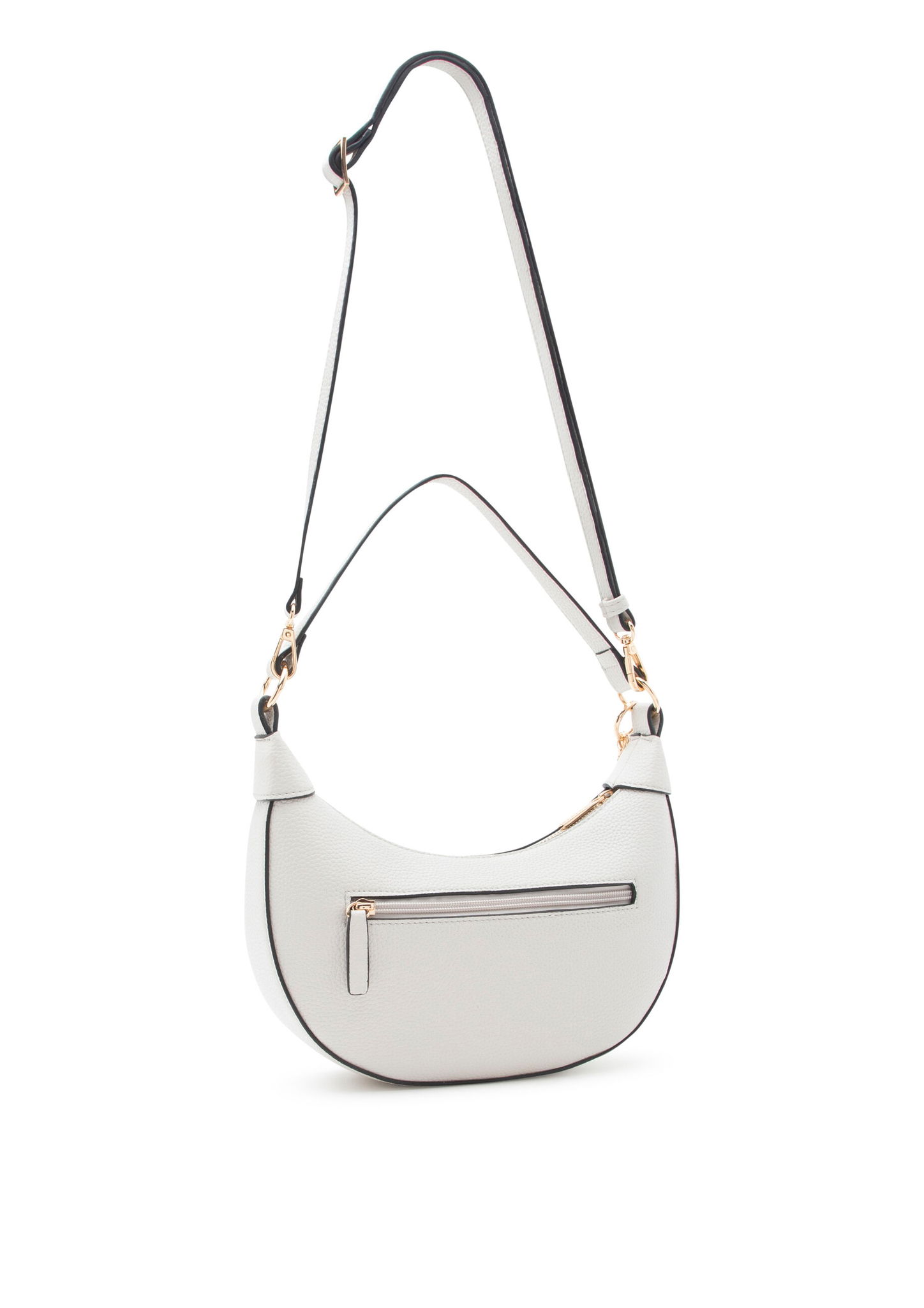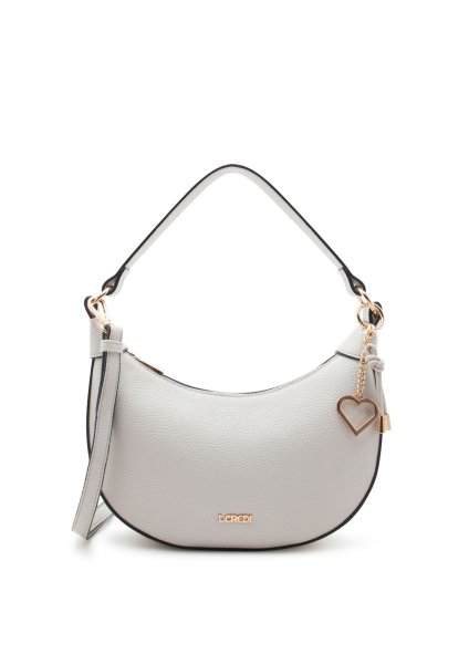 • Moderne Halbmond-Form prägt die Umhängetasche RAGNA in Light Gray mit genarbter Lederoptik. Mit Reißverschluss, Henkel und abnehmbarem Riemen ausgestattet.