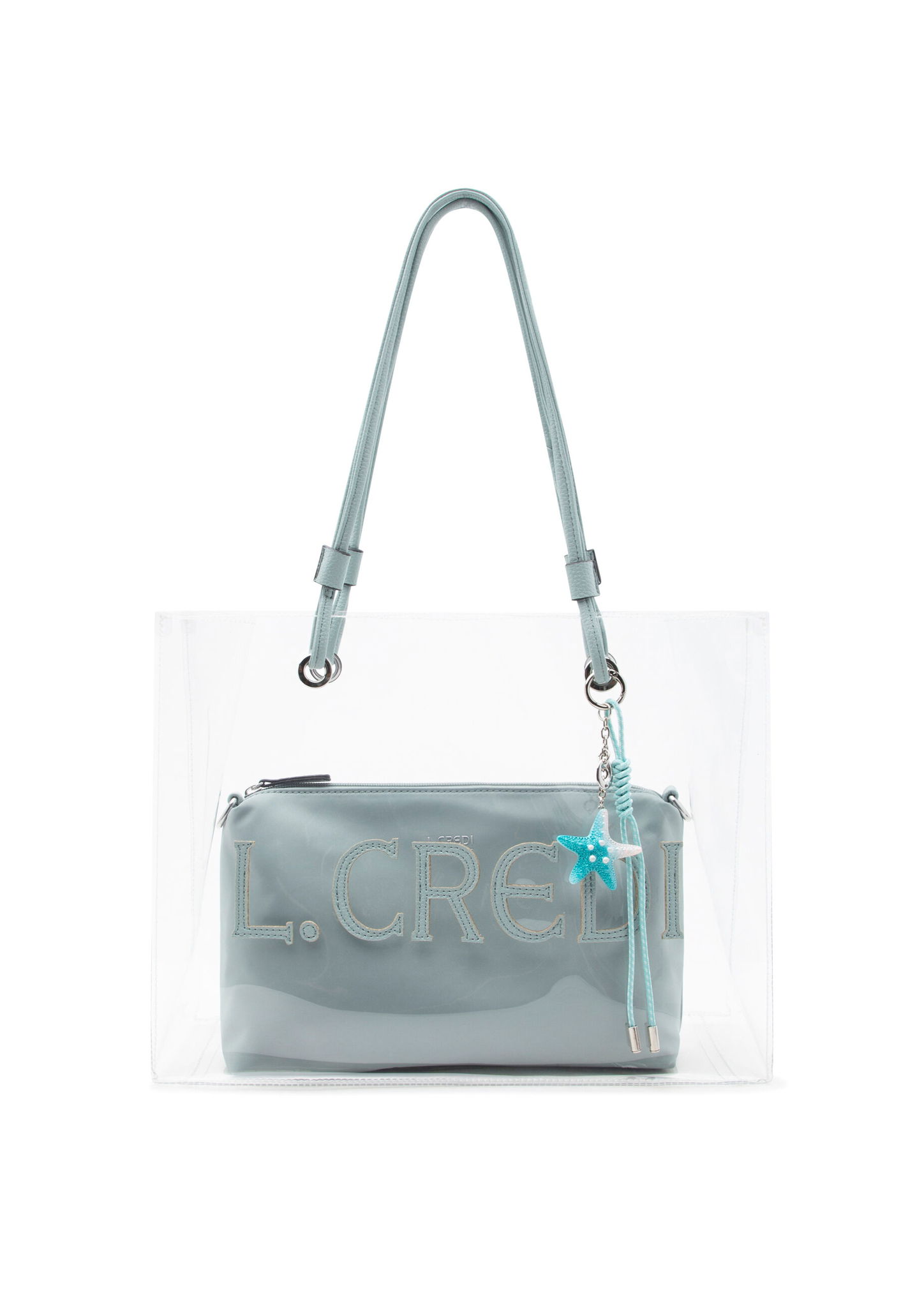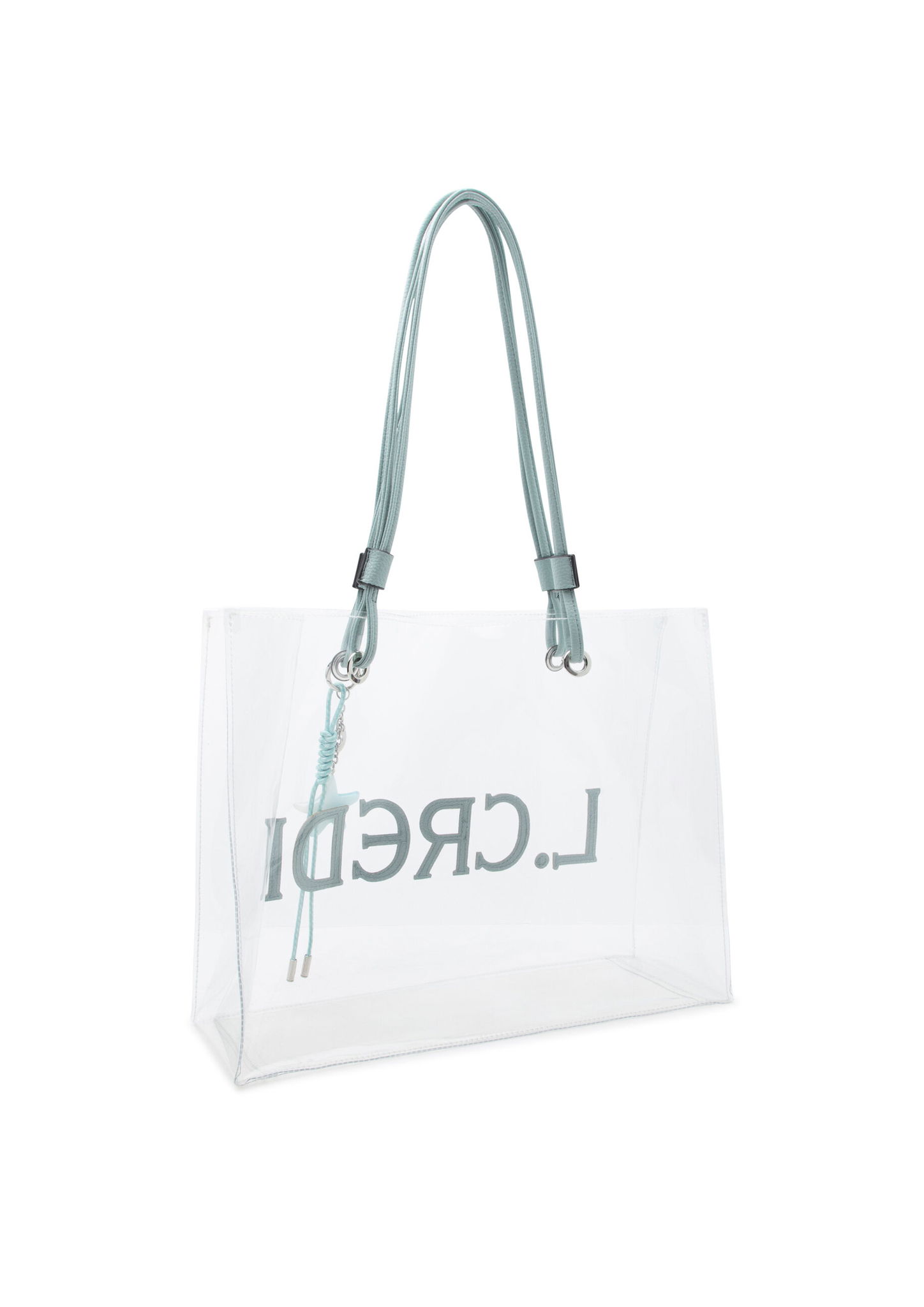 - Der Shopper REJA in Mint Blue ist aus transparentem Material mit herausnehmbarer Innentasche aus genarbtem Kunstleder. Die lässt sich solo als Crossbody tragen.