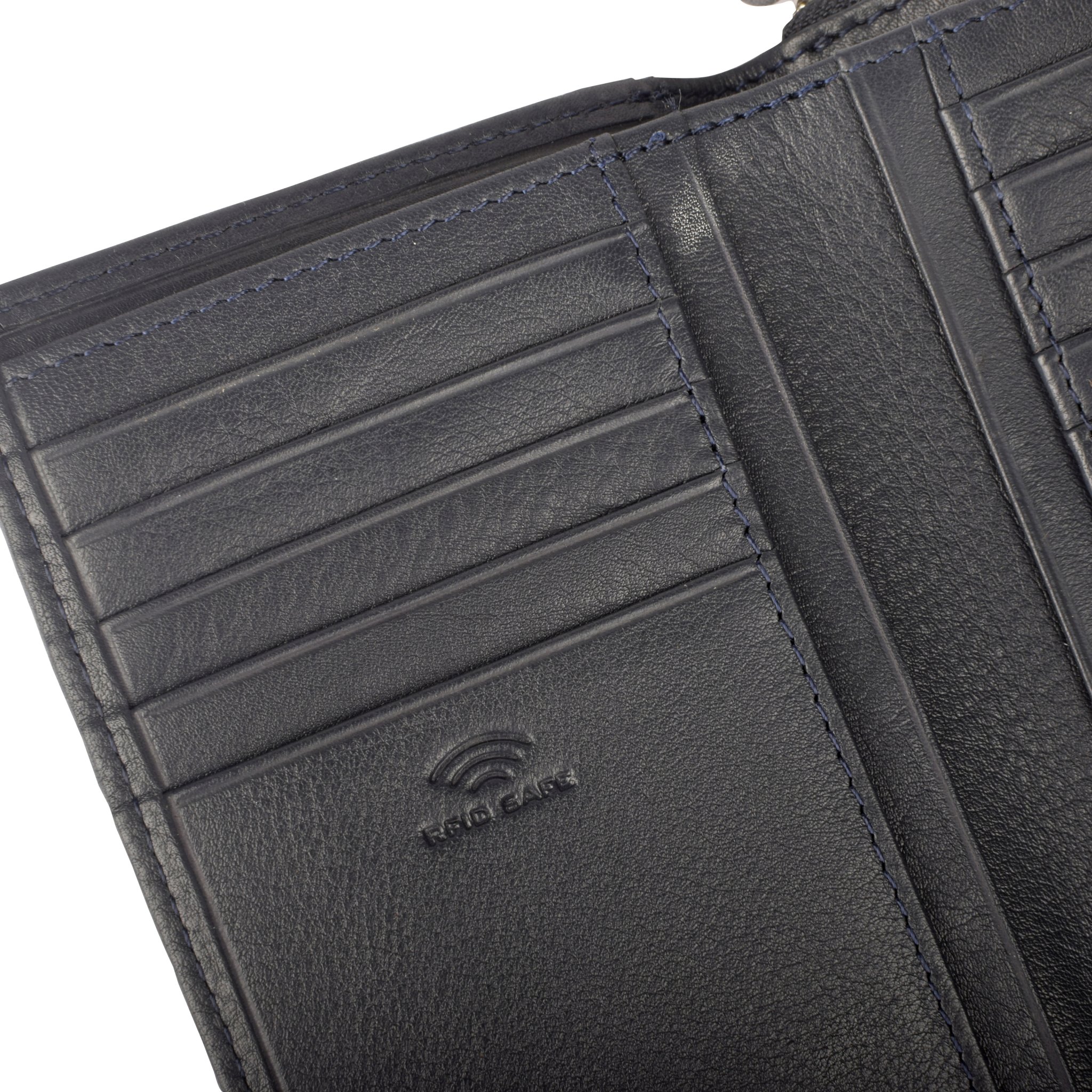 - Innen: dunkelblaues Innenfutter aus Textil, Münzgeldfach mit Reißverschluss, zwei Geldscheinfächer, vierzehn Kreditkartenfächer, vier Steckfächer