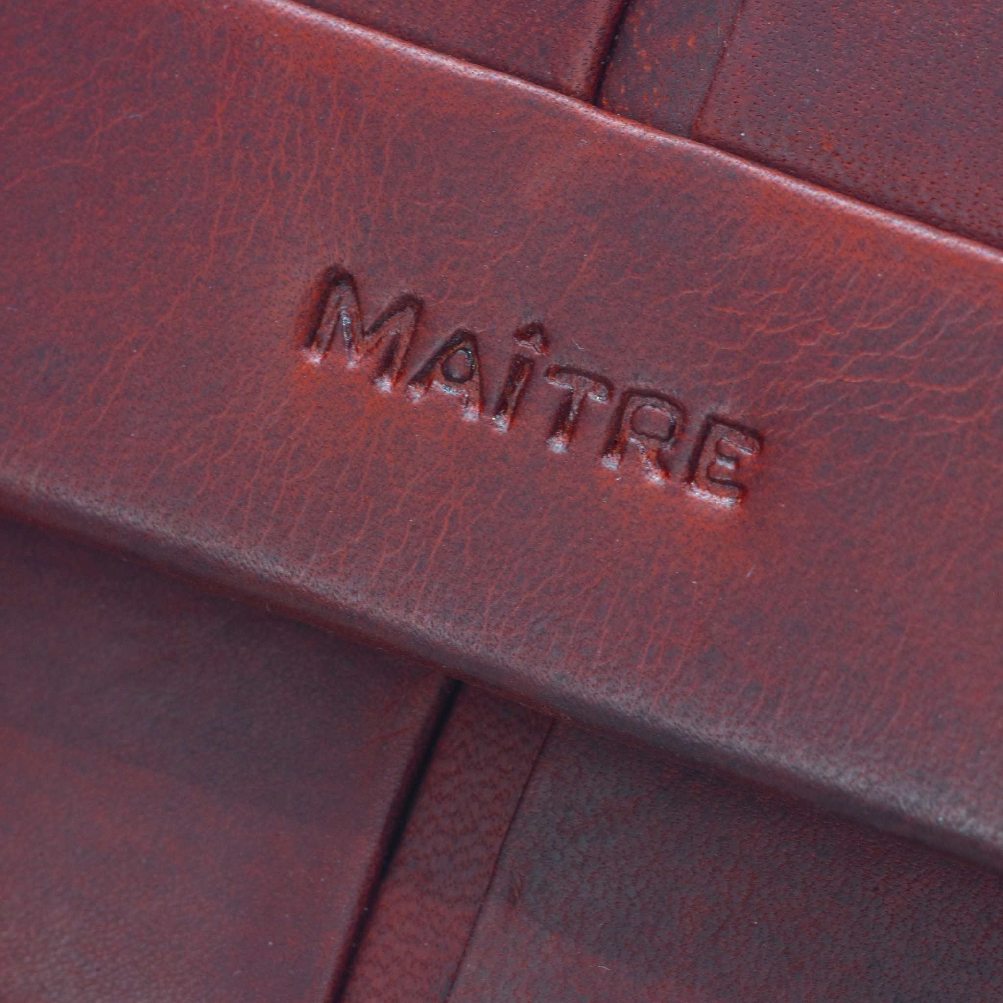 - Außen: rotes glattes Fettleder, Überschlag mit Druckknopf, silberfarbene Metalldetails, Logoprägung auf der Vorderseite, RFID-Schutz