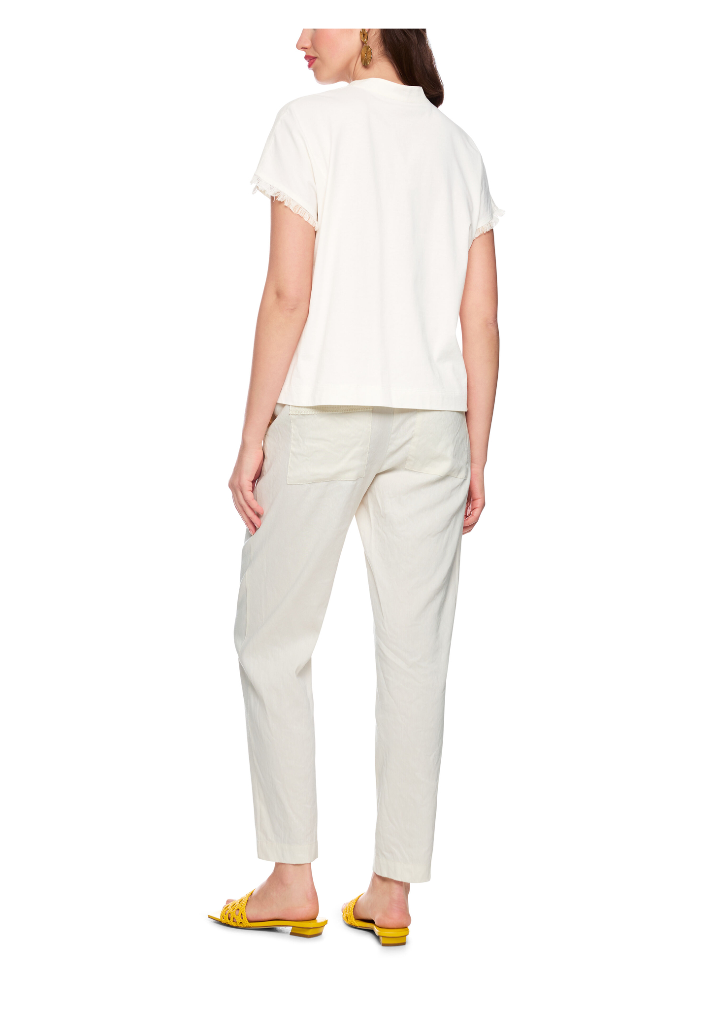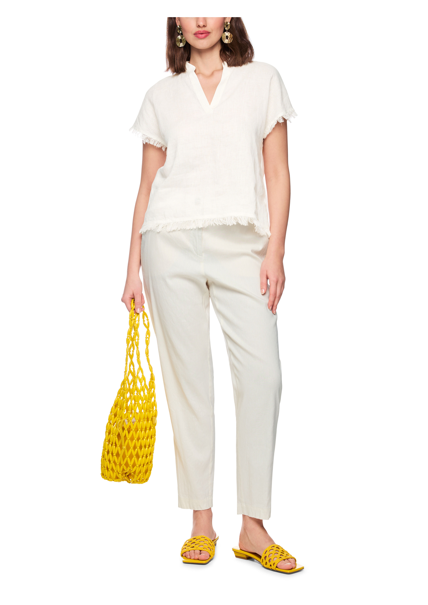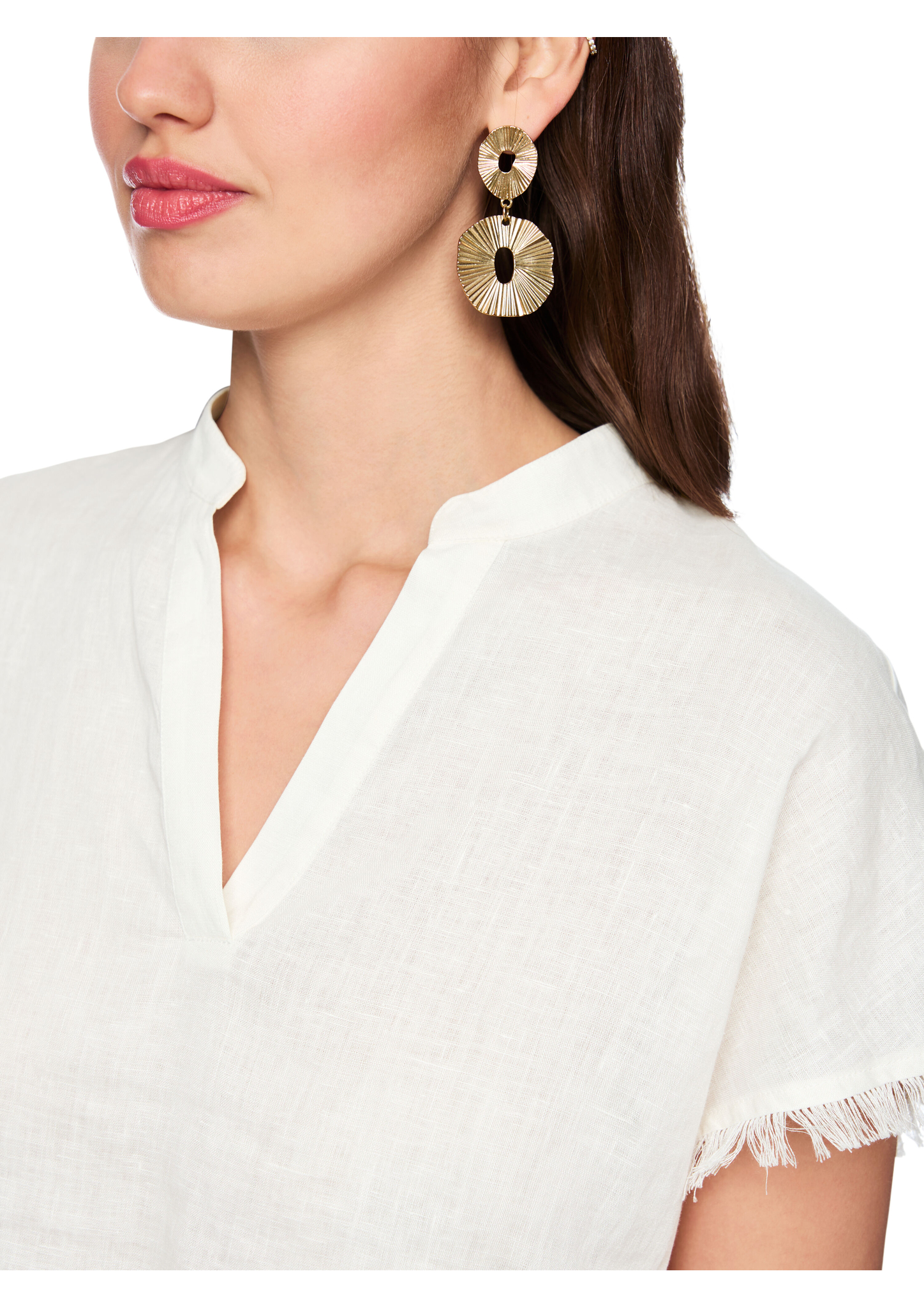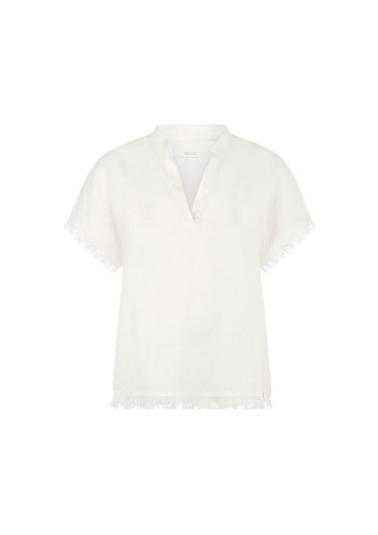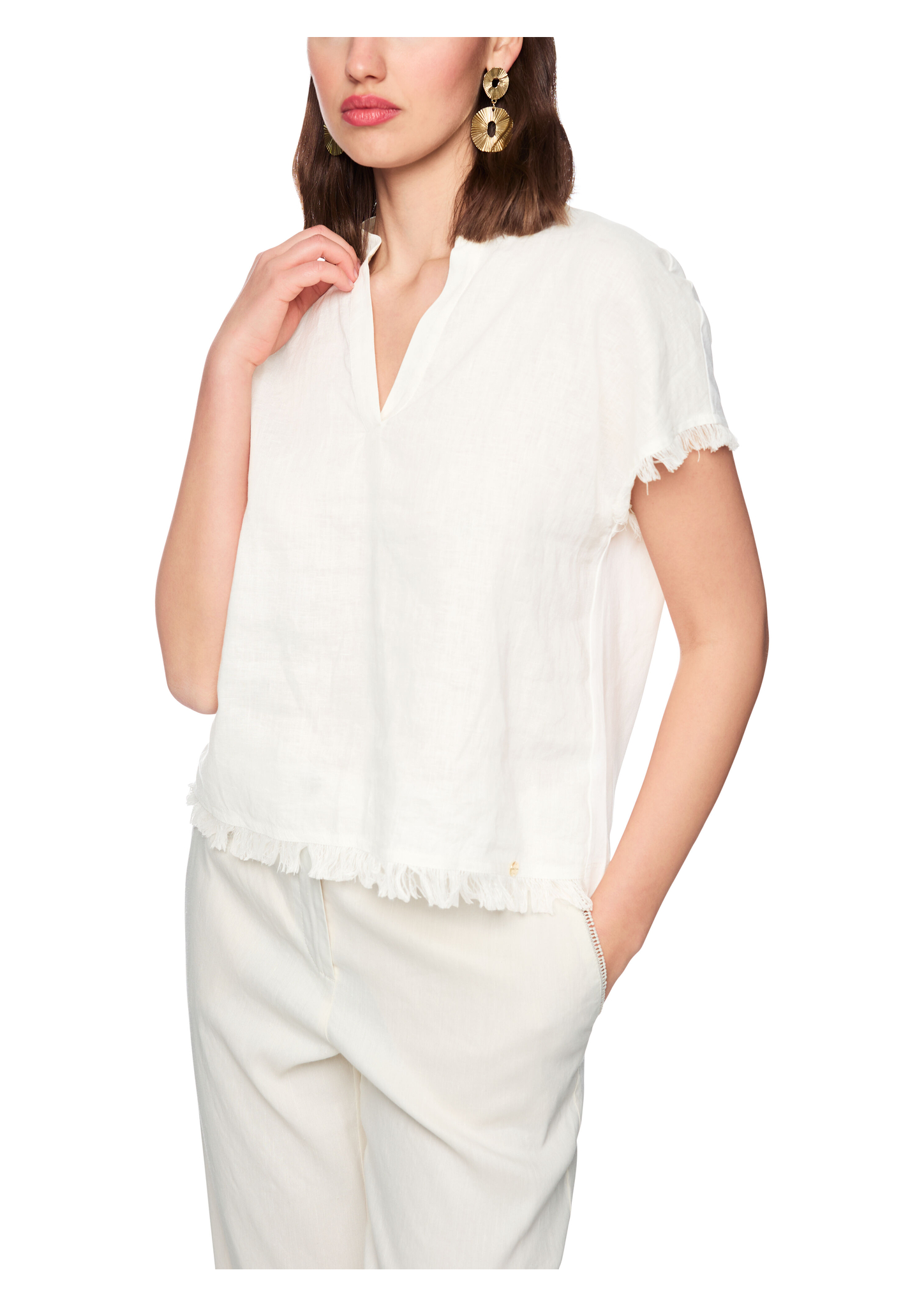 Blusenshirt aus Leinen-Baumwolle-Mix|Das locker geschnittene Blusenshirt besticht mit modernem Materialmix: Leinen vorne und weiche Baumwolle hinten. Der feminine V-Ausschnitt mit kleiner Blende am Kragen verleiht eine elegante Note. Kurze, angeschnittene Ärmel sowie dekorative Fransen an Ärmelabschlüssen und Saum sorgen für einen lässigen, sommerlichen Look mit Stil.|Locker geschnitten|Kurze Ärmel|V-Ausschnitt|Fransenverzierung|Das Model ist 179 cm groß und trägt N3/38.