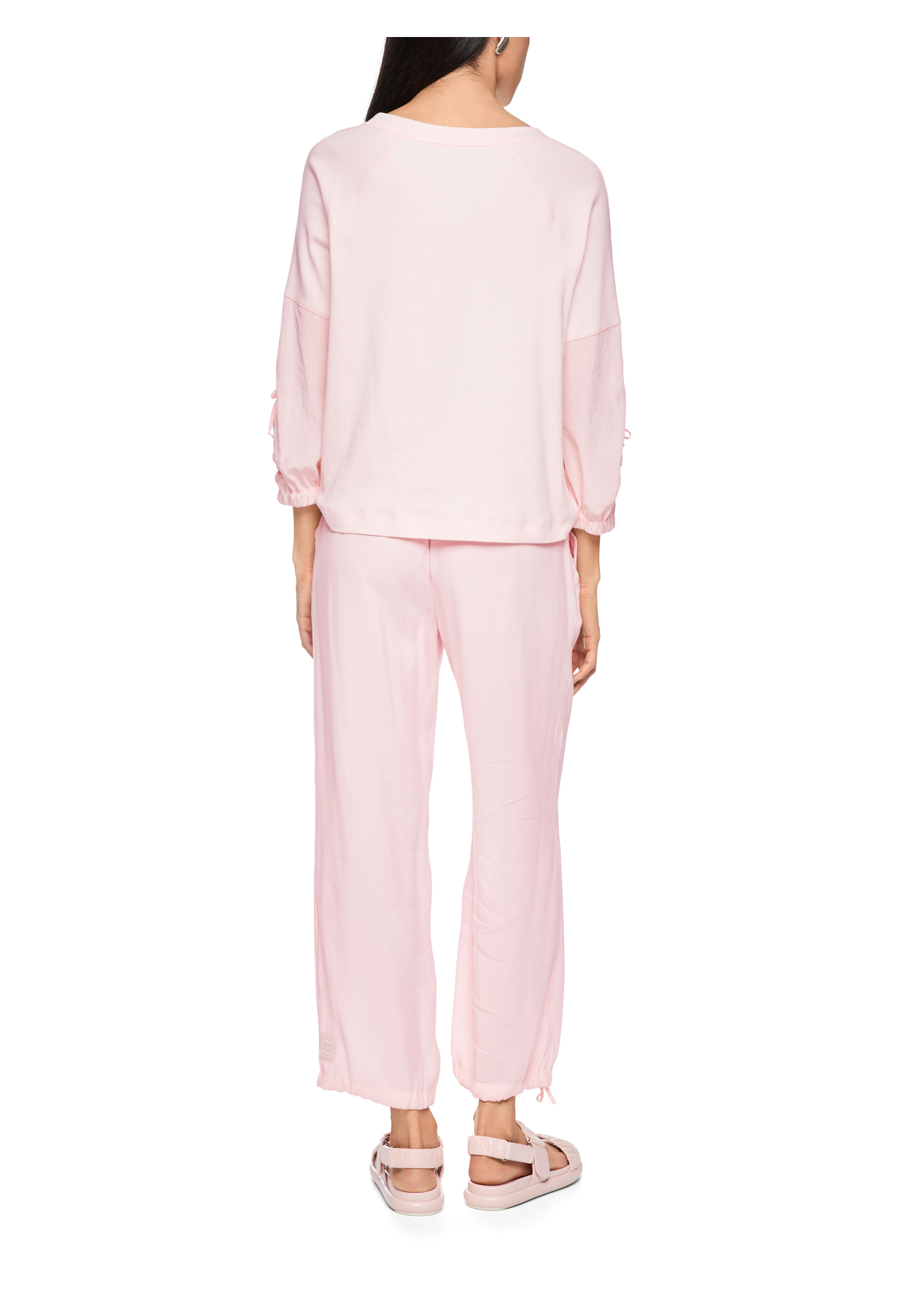 Locker geschnittenes Blusenshirt im Materialmix. Das Shirt besticht vor allem durch seinen hohen Tragekomfort durch luftig-leichte Materialien. Die Rückseite und der obere Bereich der Ärmel ist mit einem Baumwollripp versehen, während der Vorderteil und die restlichen Ärmel aus einem locker fließenden Stoff gefertigt sind. Die Ärmel besitzen eine entspannte 3/4-Länge und kommen mit seitlichen Raffungen und Gummibund.
