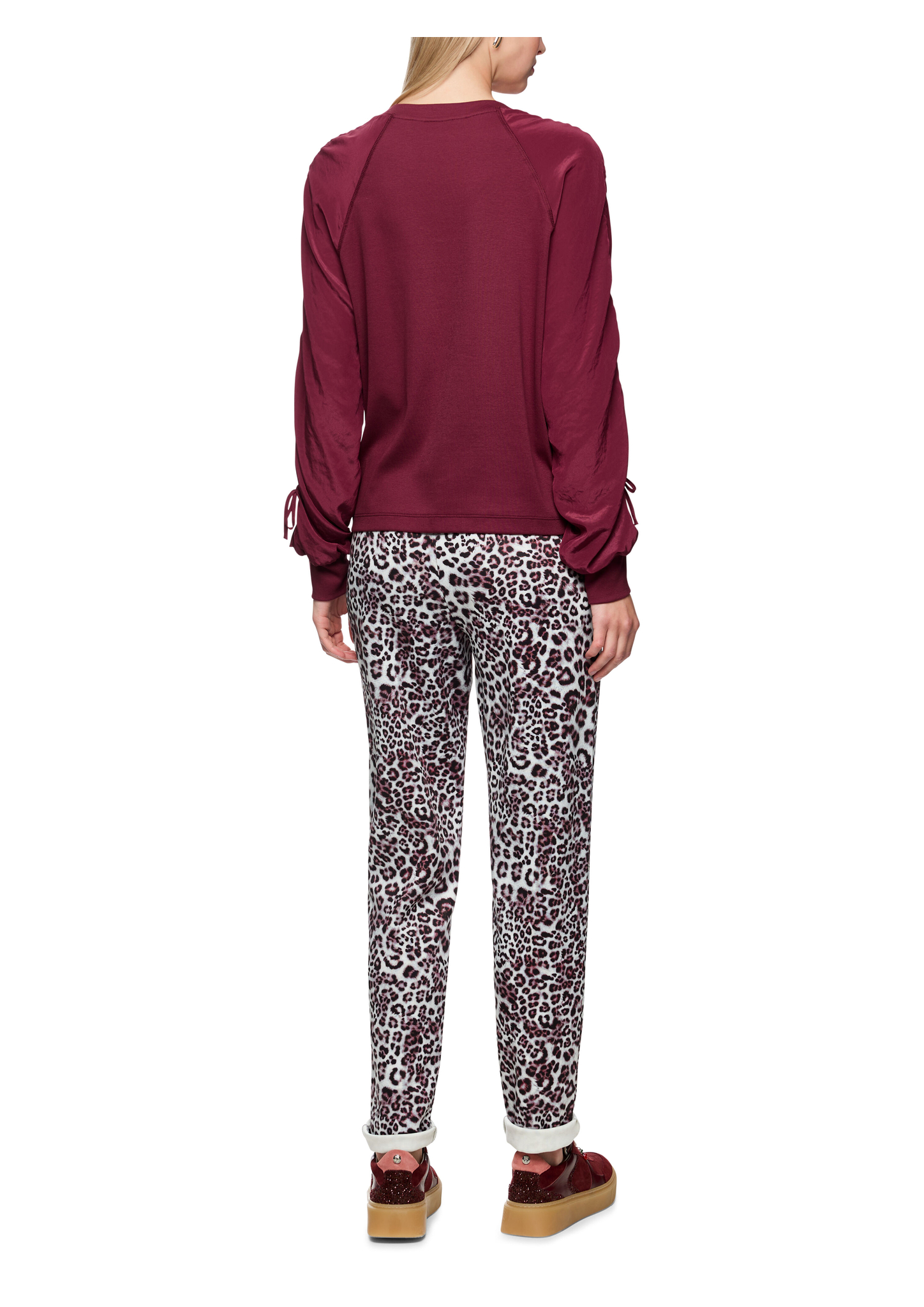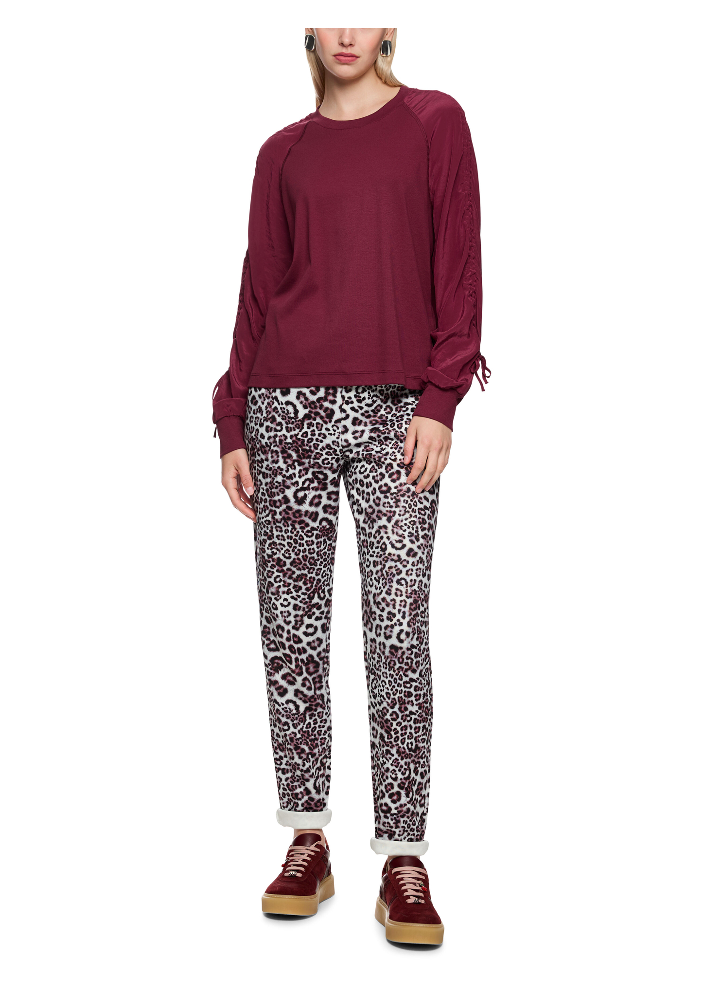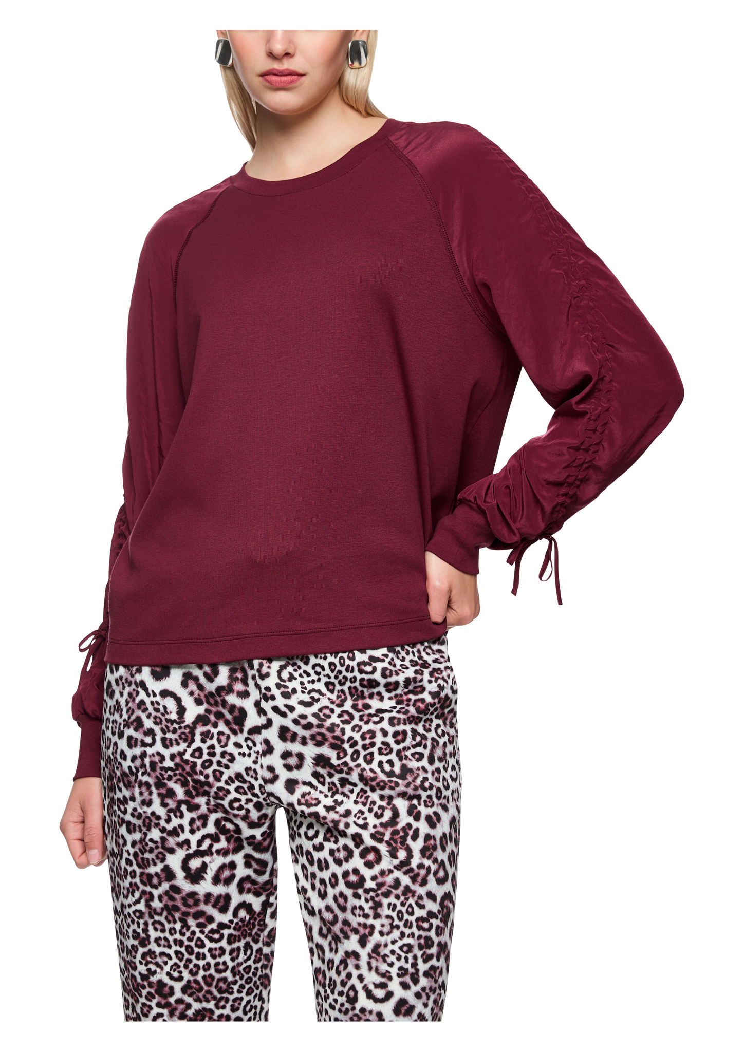 Dieses lässige Blusenshirt verbindet sportliche und schicke Elemente in einem. Es kommt mit lockerem Schnitt und Raglan Ärmeln. Der Mittelteil und die Bündchen sind aus einem leicht gerippten Stoff gefertigt, während die Ärmel und den Ausschnitt ein fließendes Material zieren. Highlight der Bluse sind die Raffungen an den Ärmeln.