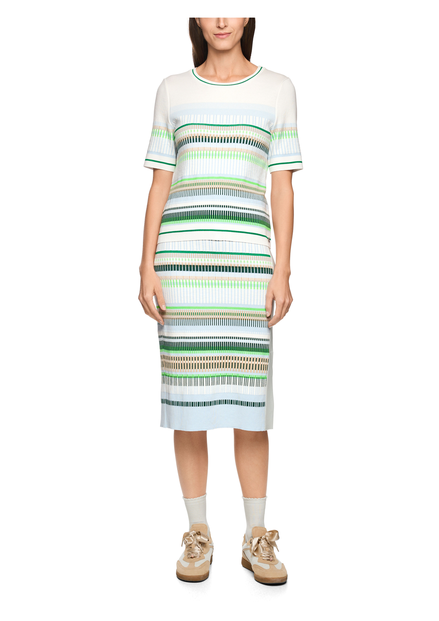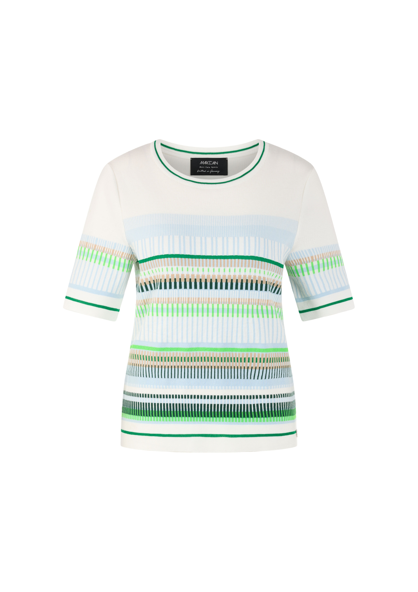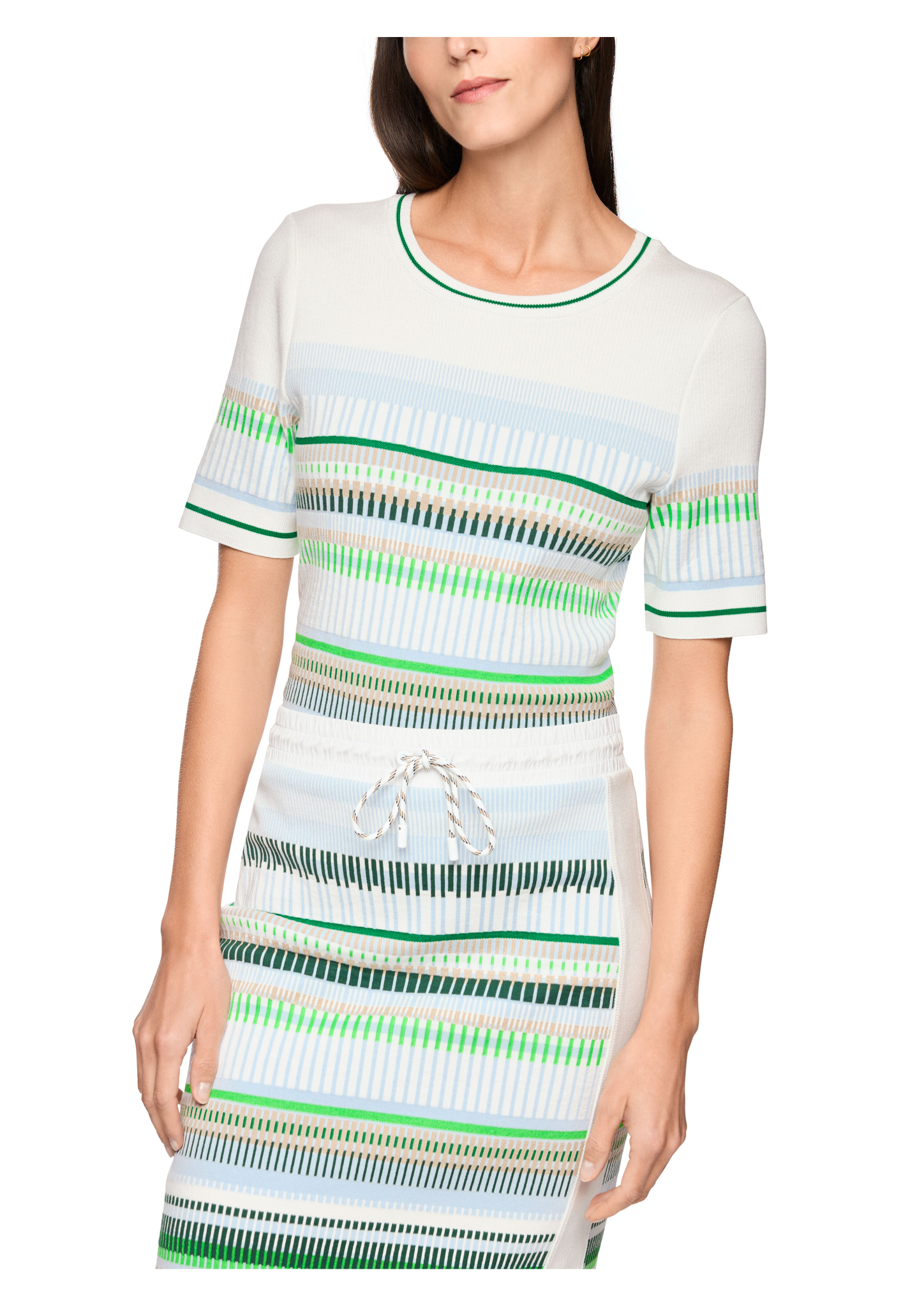 Schmal geschnittener Feinstrick-Pullover aus softem Baumwollmix mit edlem Jacquardmuster. Der klassische Rundhalsausschnitt und die kurzen Ärmel verleihen dem Design feminine Leichtigkeit. Das Modell ist "Knitted in Germany": Das Verstricken der Garne auf hochmodernen Strickmaschinen und die Veredelung der Stoffe geschehen am Standort Deutschland.