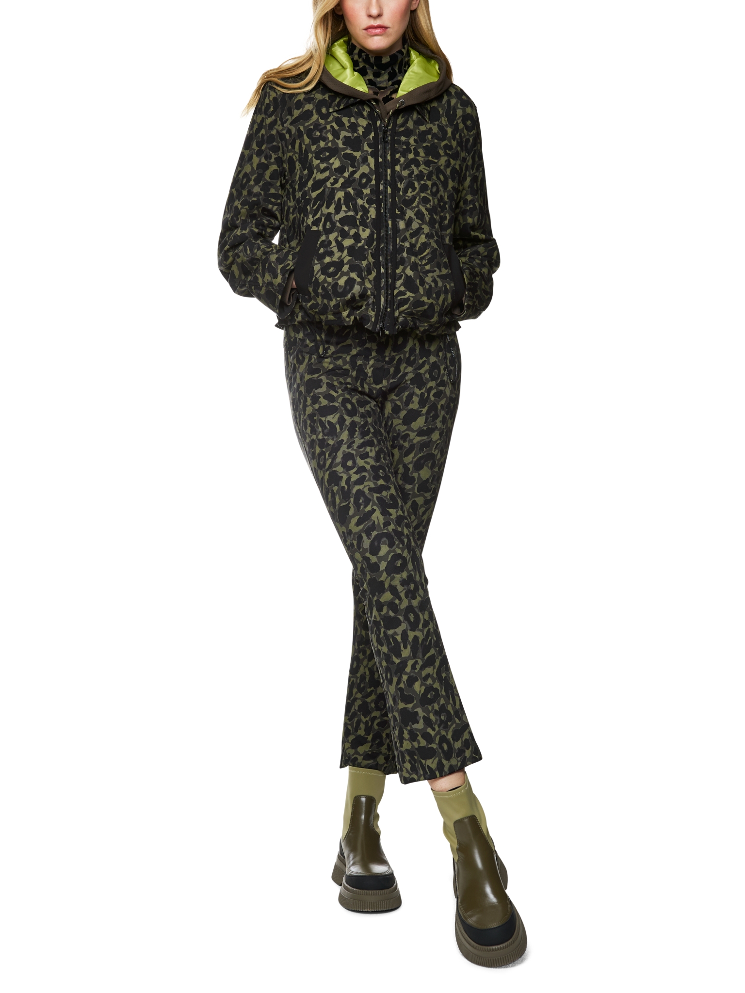 Jacke aus Stretch-Stoff Kastig geschnittene Jacke in verkürzter Form mit Leo-Blumen-Print. Sie verfügt über einen klassischen Kragen und wird mit einem Reißverschluss geschlossen. Funktionelle Details sind verdeckte vertikale Taschen und ein versteckter Gummizug an der Hüfte zum Anpassen der Weite. Dank des Stretch-Materials bietet die Jacke einen sehr angenehmen Tragekomfort.
