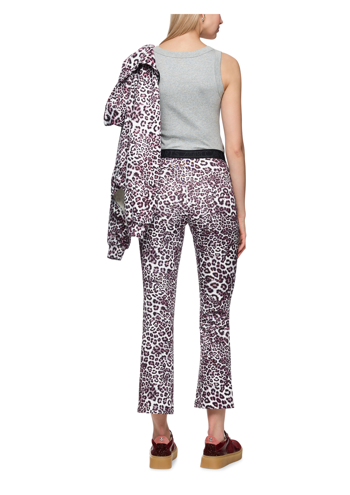 Das Modell SOFIA präsentiert sich mit einer leicht verkürzten Beinlänge und einem eng anliegenden Schnitt. Das Bein ist nach unten hin leicht ausgestellt. Das Material ist angenehm weich und elastisch. Die Hose ist zusätzlich mit einem Gummibund mit Marc Cain Logo versehen, was einen hohen Tragekomfort garantiert. Ein echter Hingucker ist der trendige Leo-Print.
