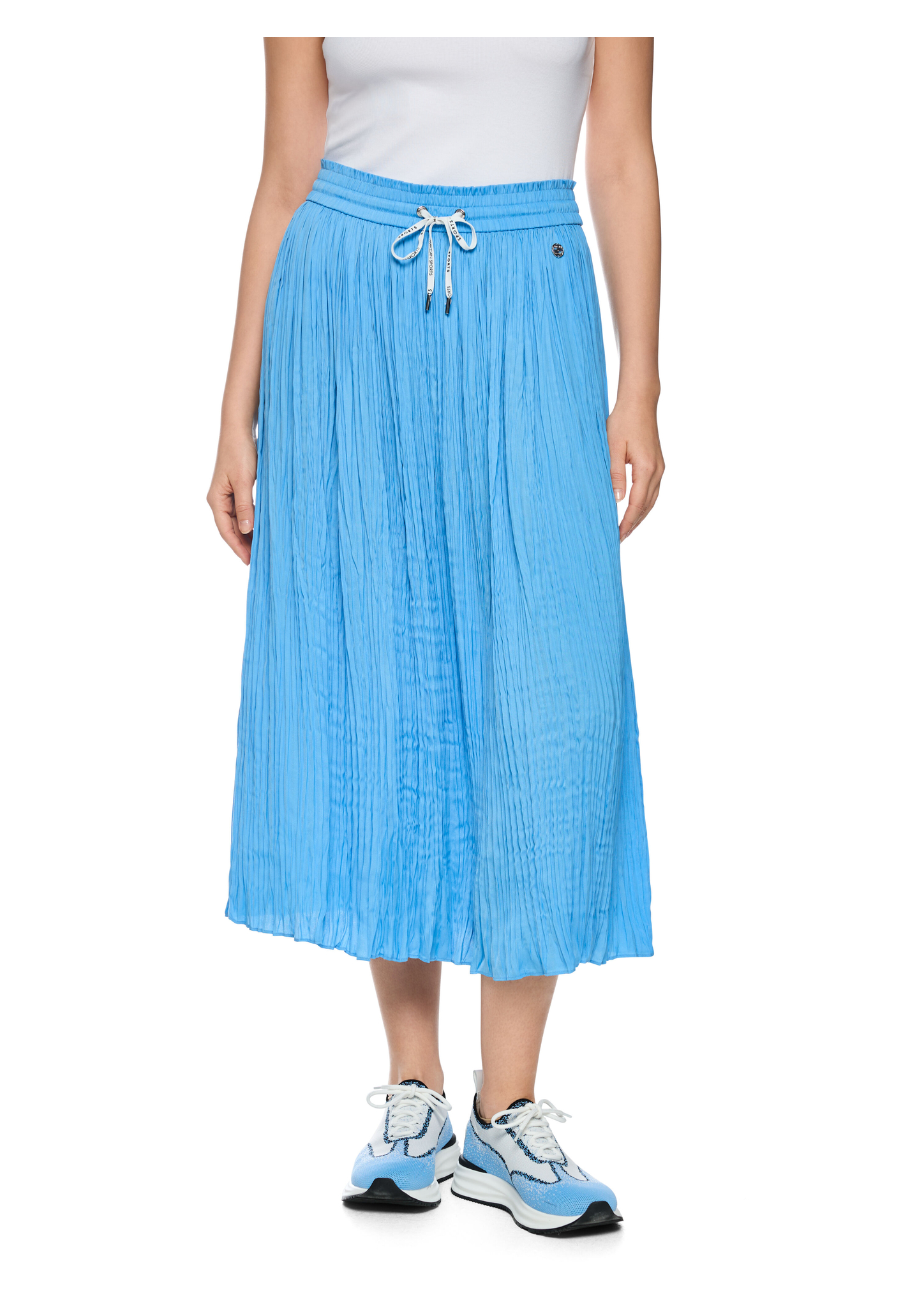 Plissee-Rock "Rethink Together"|Plissierter Midirock aus fließendem, leichtem Stoff. Der praktische Gummibund sorgt für den perfekten Tragekomfort und wird ergänzt durch ein sportliches Band mit Marc Cain Sports Logo. Die Kombination aus Struktur, Farbe und sportivem Bund verleiht dem Modell eine moderne und zugleich feminine Ausstrahlung. Das Modell wird verantwortungsbewusst produziert und trägt das Nachhaltigkeitslabel "Rethink Together".|Weite Form|Rethink Together|Mit Gummibund|Plissee|Das Model ist 179 cm groß und trägt N3/38.