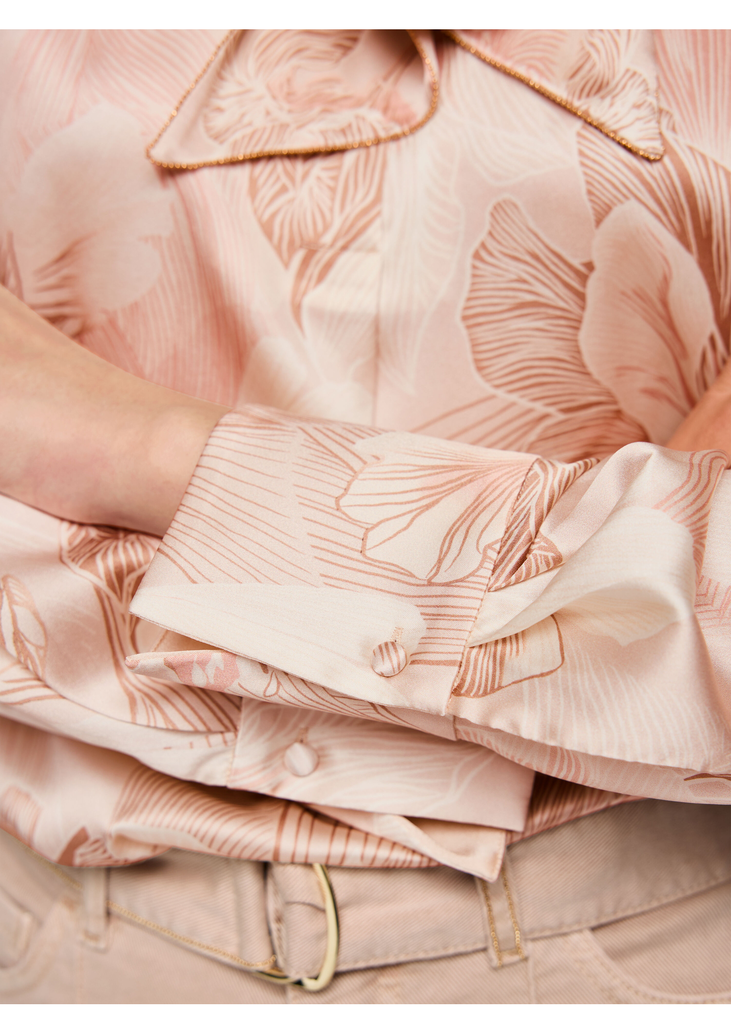Eine edle Schluppenbluse aus feinem Seiden-Elastan-Mix mit dezentem, elegantem Allover-Blumenprint. Der klassische Hemdkragen verleiht eine zeitlose Note, während das Schleifenband mit eingearbeiteter, dekorativer Zierkette einen modernen Akzent setzt. Ein feminines Statement-Piece mit luxuriösem Tragegefühl.