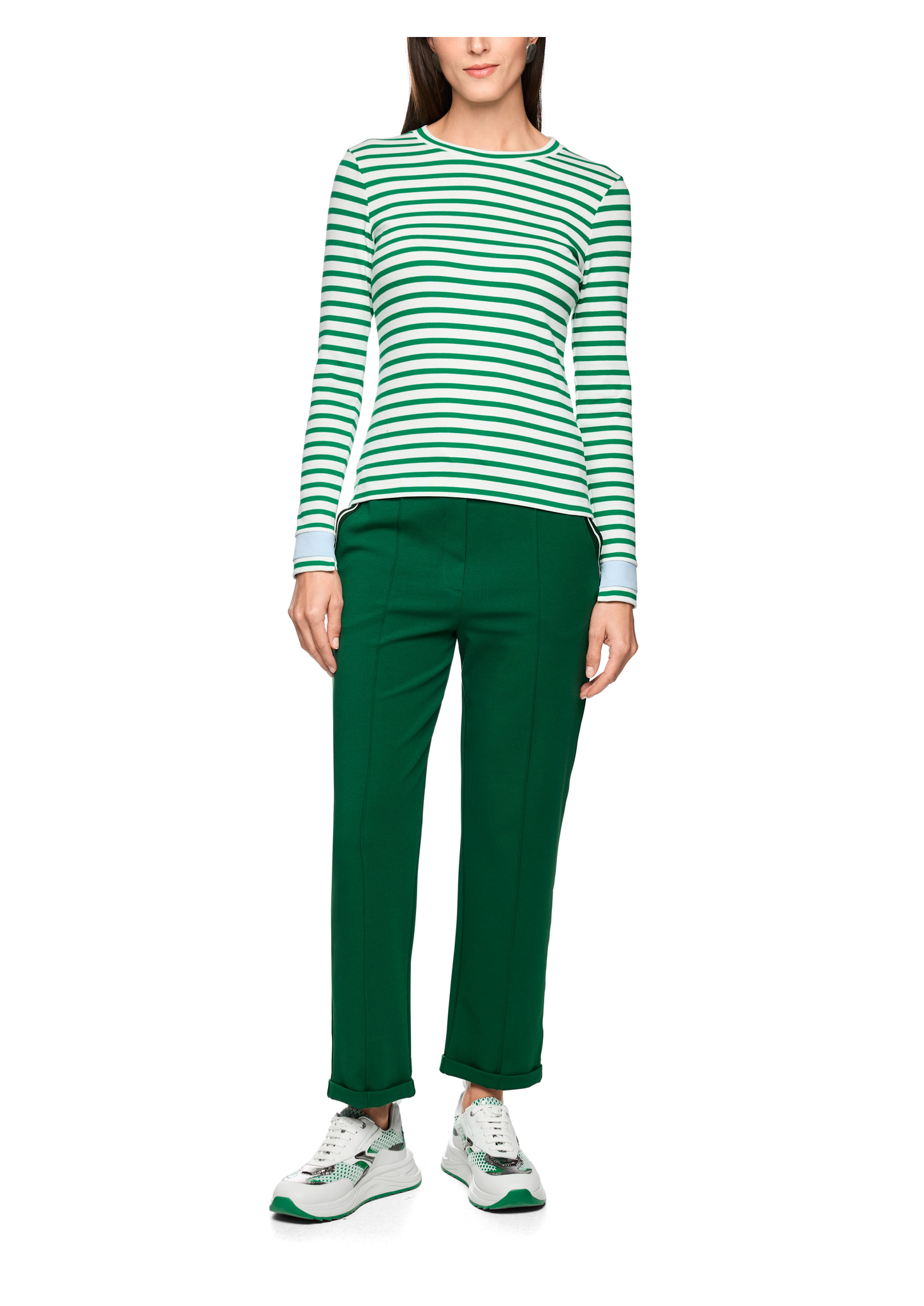 Figurbetontes Ringelshirt aus softem Baumwollstretch für eine perfekte Passform und hohen Tragekomfort. Kontrastfarbige Ringeldetails und kurze Schlitze an den Ärmelabschlüssen verleihen dem Longsleeve eine moderne Note. Mit klassischem Rundhalsausschnitt ideal für lässige oder feminine Alltags-Looks