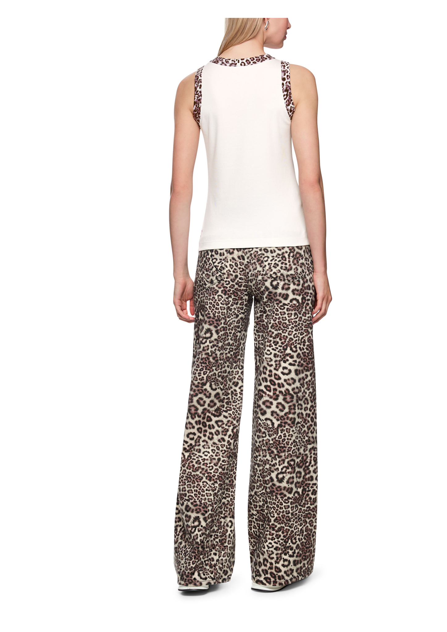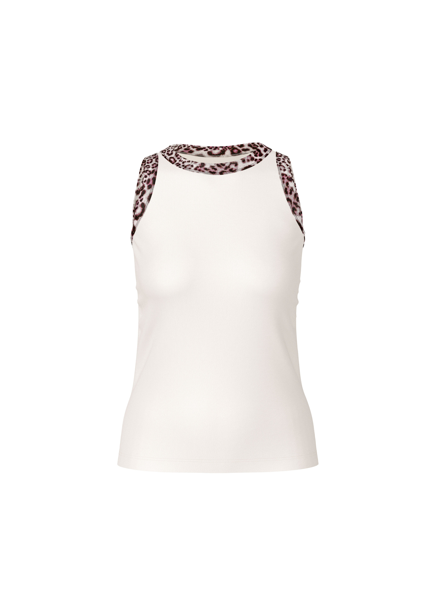 Das ärmellose Top ist aus softem und flexiblem Baumwollripp gefertigt. Es ist körpernah geschnitten und hat markante Einfassungen mit Leo Muster an Dekolletee und Armausschnitten. Das macht es zu einem perfekten Basic mit dem gewissen Etwas.