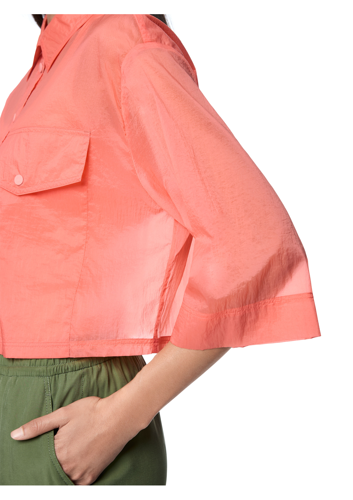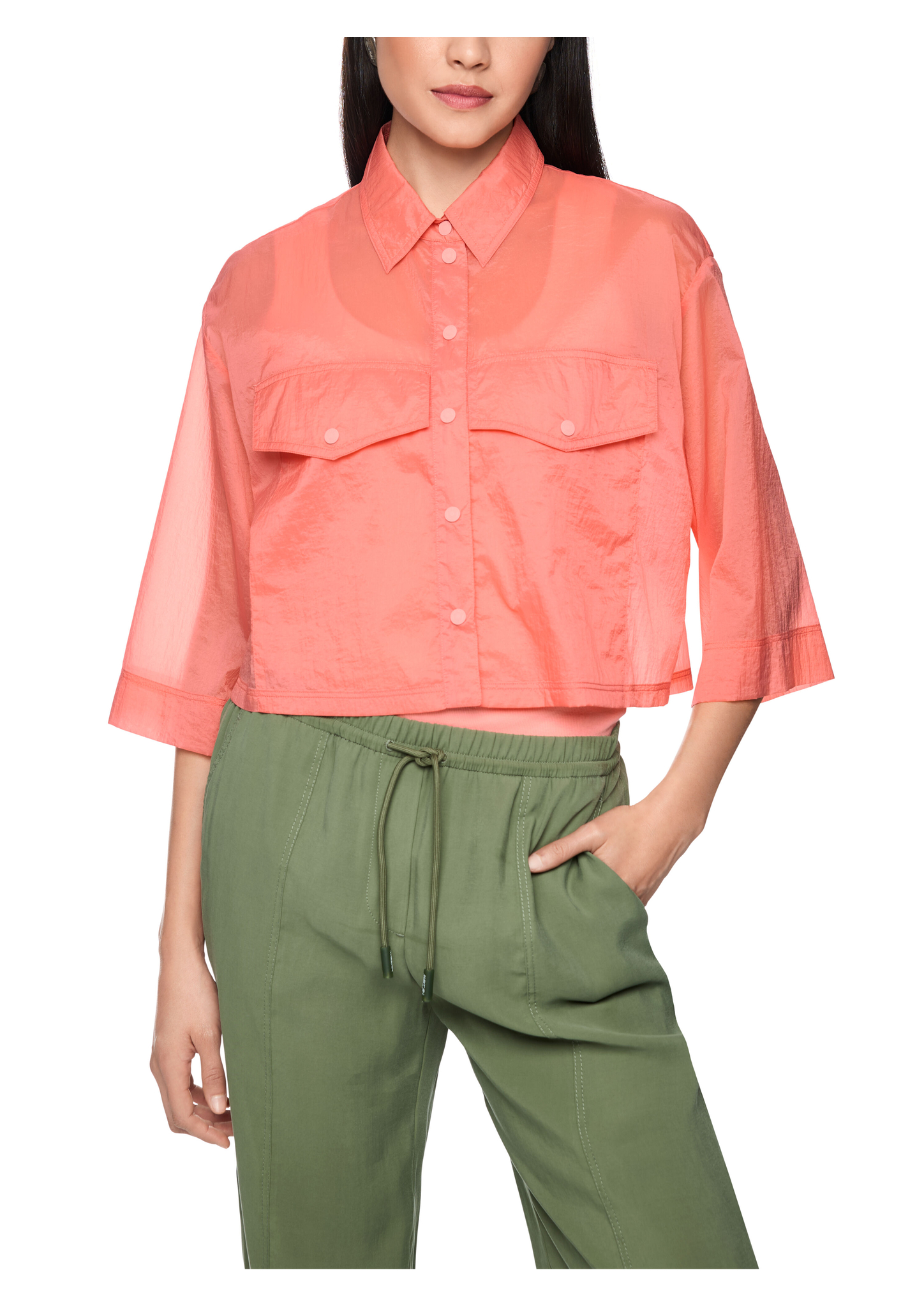 Transparente Hemdbluse|Diese Bluse ist ein echter Hingucker durch die weite Form, den verkürzten Schnitt und den transparenten Stoff. Das luftig-leichte Material ist angenehm zu tragen und perfekt für die wärmeren Sommertage geeignet. Weitere Details der Bluse sind der Hemdkragen, die lässigen 3/4-Ärmel und die großen Taschen auf der Vorderseite. Geschlossen wird die Bluse mit einer Druckknopfleiste.|Weite Form|Druckknöpfe|Leicht transparent|3/4-Ärmel|Das Model ist 179 cm groß und trägt N3/38.