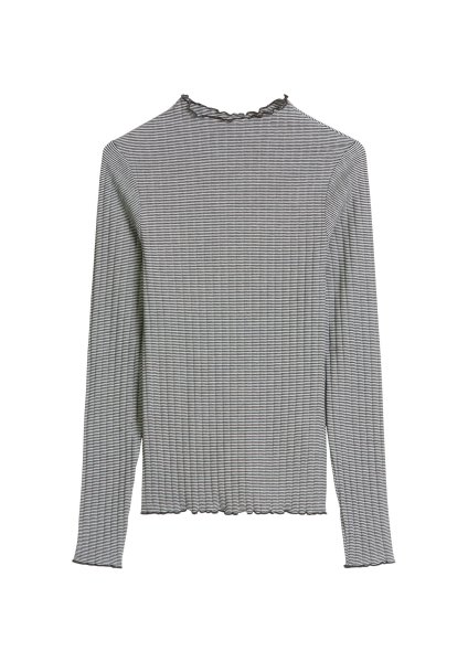 Die lässigen "Rüschenkanten" an Kragen, Ärmelabschluss und Saum entstehen durch absichtliches Überdehnen der Kanten während des Nähvorgangs. Der Effekt kann sich sehen lassen und kommt besonders gut zur Geltung, wenn das Oberteil als Unterzieher getragen oder im Lagenlook mit anderen Teilen kombiniert wird. Das Langarm-Shirt von Marc O’Polo DENIM hat einen femininen Slim Fit mit Stehkragen und langen, schmalen Ärmeln. Die Qualität: ein supersofter, stretchiger Ripp-Jersey aus hochwertigem Bio-Baumwoll-Mix.
