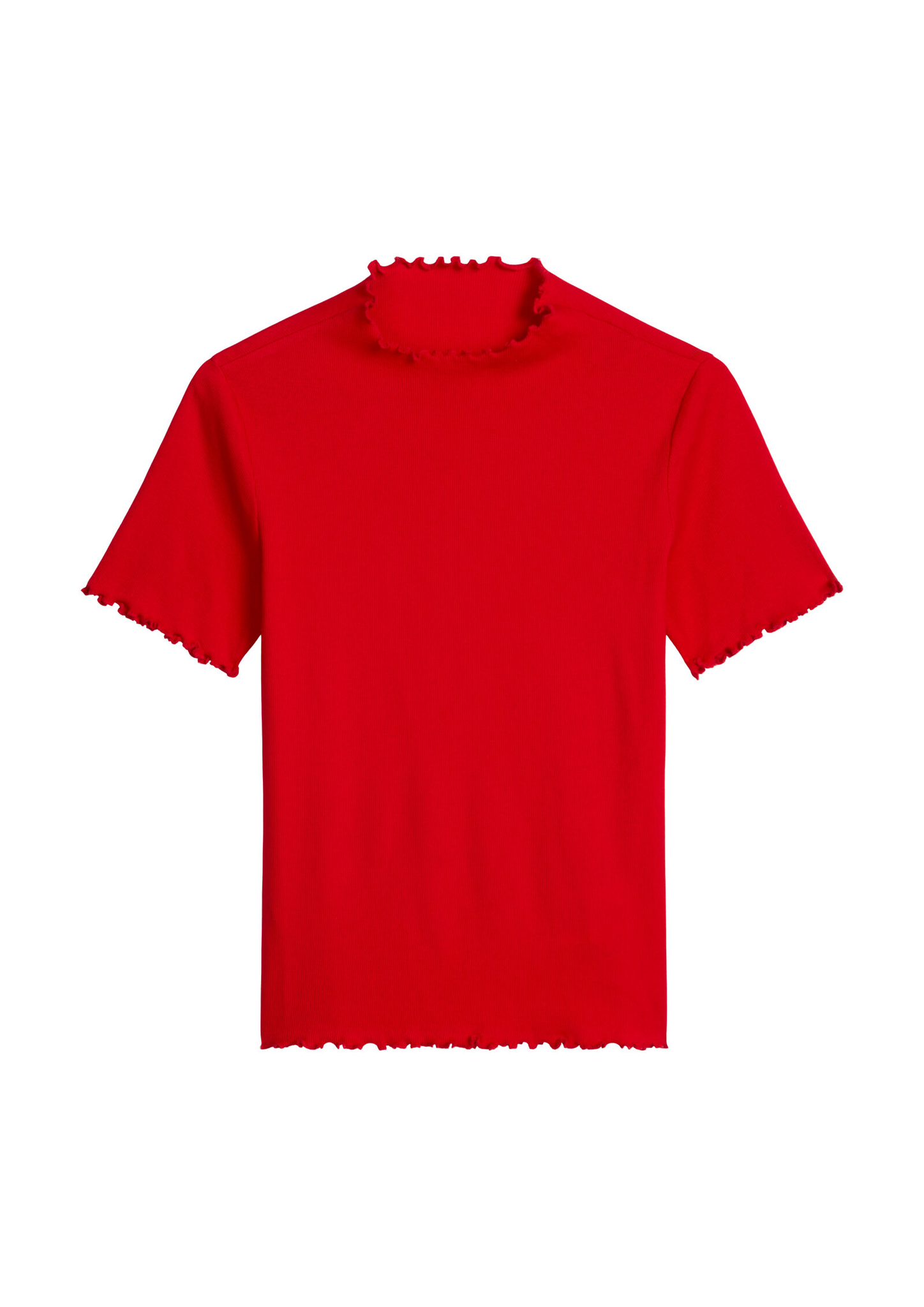 Die lässigen "Rüschenkanten" an Kragen, Ärmelabschluss und Saum entstehen durch absichtliches Überdehnen der Kanten während des Nähvorgangs. Der Effekt kann sich sehen lassen und kommt besonders gut zur Geltung, wenn das Oberteil als Unterzieher getragen oder im Lagenlook mit anderen Teilen kombiniert wird. Das T-Shirt hat einen femininen Slim Fit mit Stehkragen und langen, schmalen Ärmeln. Die Qualität: ein supersofter, stretchiger Ripp-Jersey aus Organic Cotton Mix.