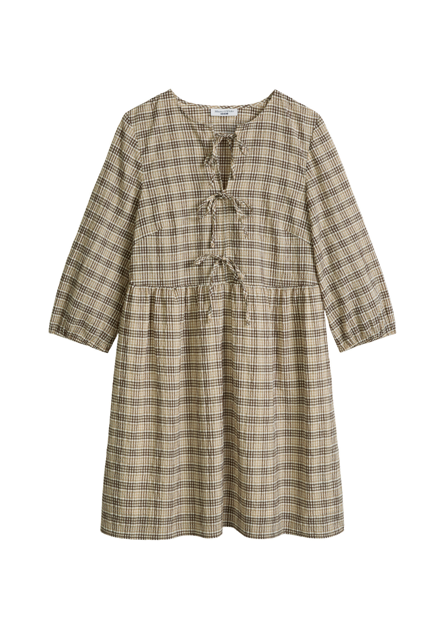 Das Kleid von Marc O’Polo DENIM ist aus leichtem Seersucker aus einem hochwertigen, karierten Baumwollmix gefertigt. Das geniale Gewebe mit seiner charakteristischen Krepp-Oberfläche sieht nicht nur einzigartig „gerafft” aus, sondern hat auch eine natürliche Funktion: Da der Stoff aufgrund seiner unregelmäßigen Struktur nicht direkt auf der Haut aufliegt, sorgt er für eine angenehme Luftzirkulation. Die Passform ist locker, der Ausschnitt rund, die Volumenärmel sind 3/4-lang und leicht gebauscht mit einem elastischen Gummizugabschluss. Die Front kann mit kleinen Bindebändern zu Schleifen gebunden werden. An der Taille ist ein weiter, geraffter Rock angesetzt. Das Kleid ist nicht gefüttert.