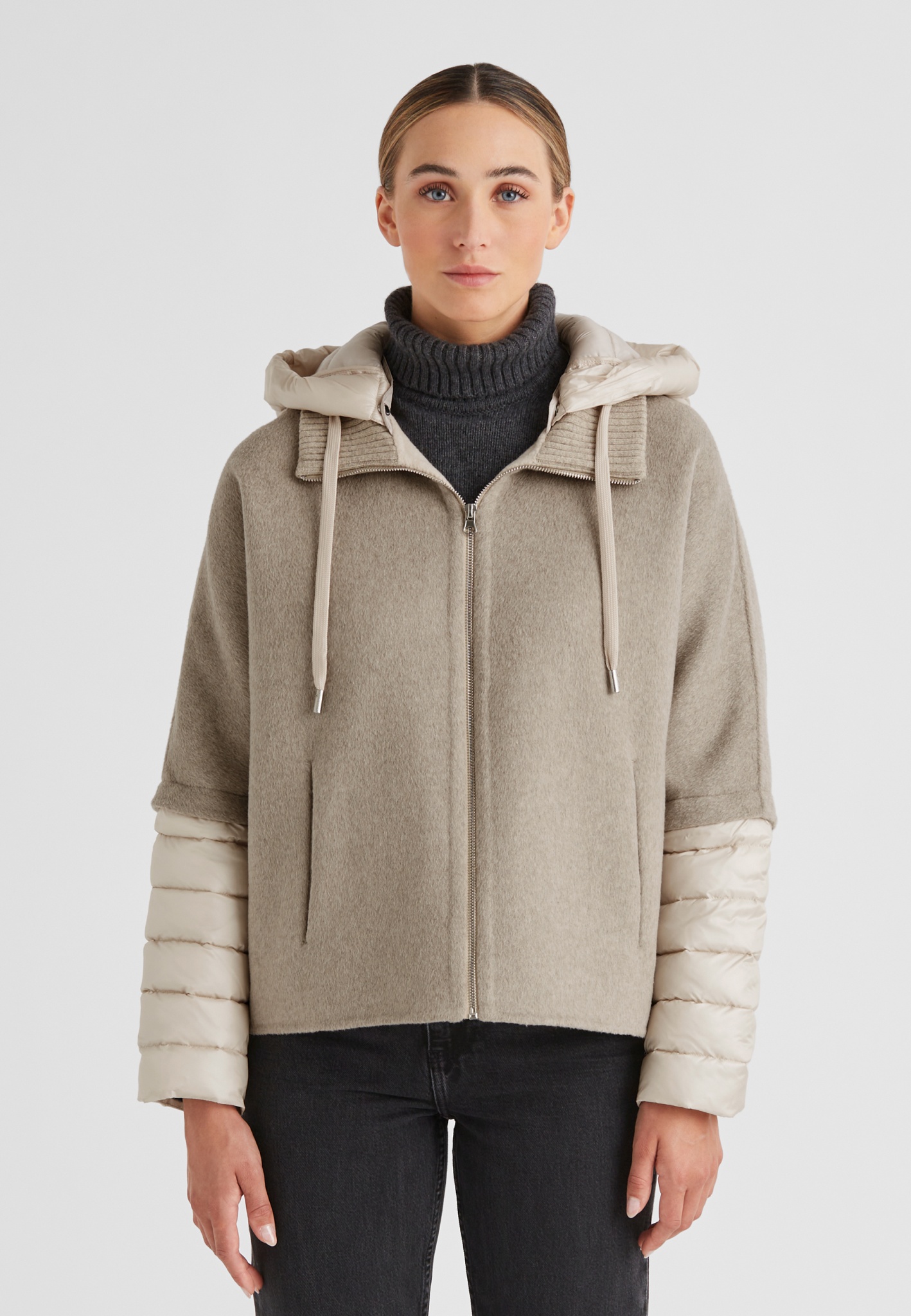- Wolle in 2-Tone mit Farbkontrast Innen/Außen, leichter A-Shape, Metall-Reißverschluss in der vorderen Mitte