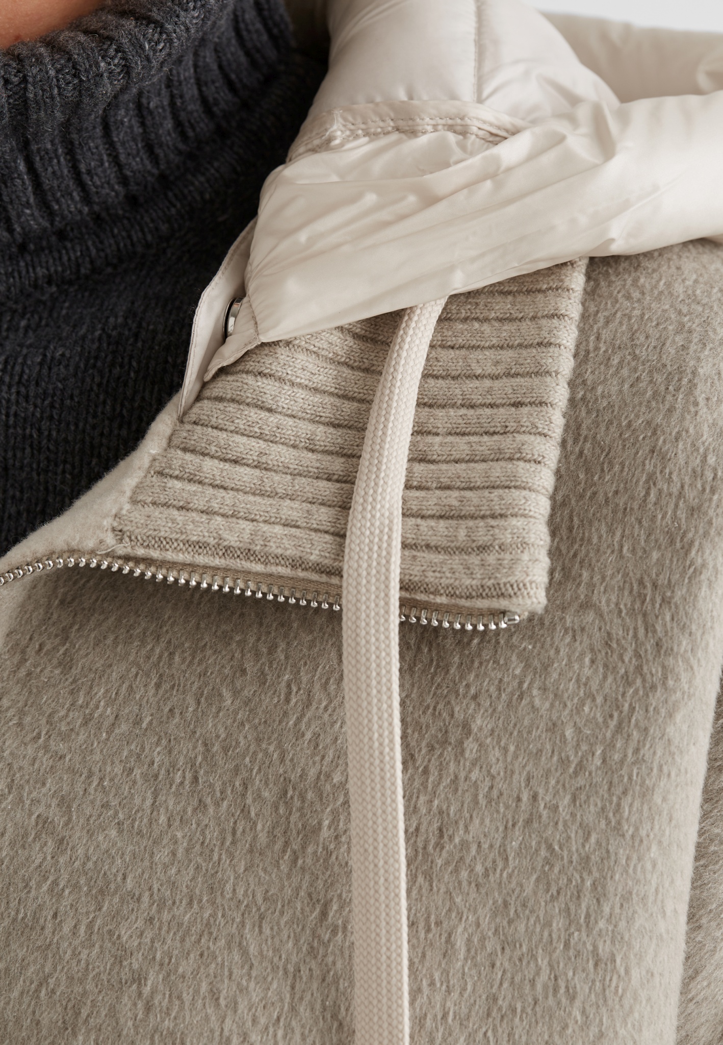 - Dekorativer Stehkragen aus Strick, Abnehmbare Kapuze aus Polyamid gesteppt mit Tunnelzug
