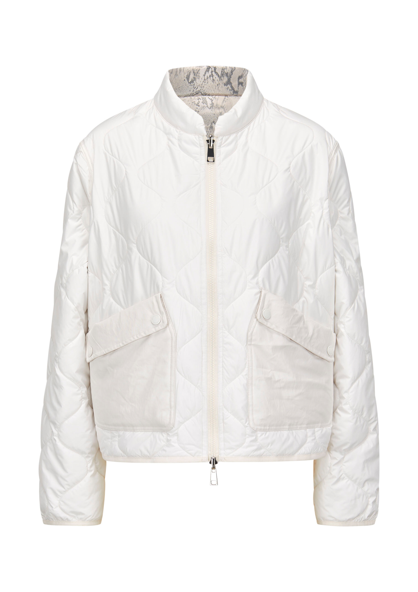 • Leichte gesteppte Wendejacke: eine Seite uni, eine Seite mit trendigem Animal Print • Gerade Passform mit zu den Seiten gerundetem Saum • Wellenstepp mit leichter 80g Wattierung • Je nach Uni-Farbe mit Leoprint oder Snakeprint auf der anderen Seite • schmaler gerundeter Stehkragen • 2-Wege Kunststoff-Reißverschluss in der vorderen Mitte • Printseite mit Reißverschlusstaschen, Uniseite mit aufgesetzten Taschen aus Baumwollmix-Ware • Saum und Ärmelabschluss mit elastischem Fischgrat-Band eingefasst • neues Silikon-Logo-Badge Ton in Ton