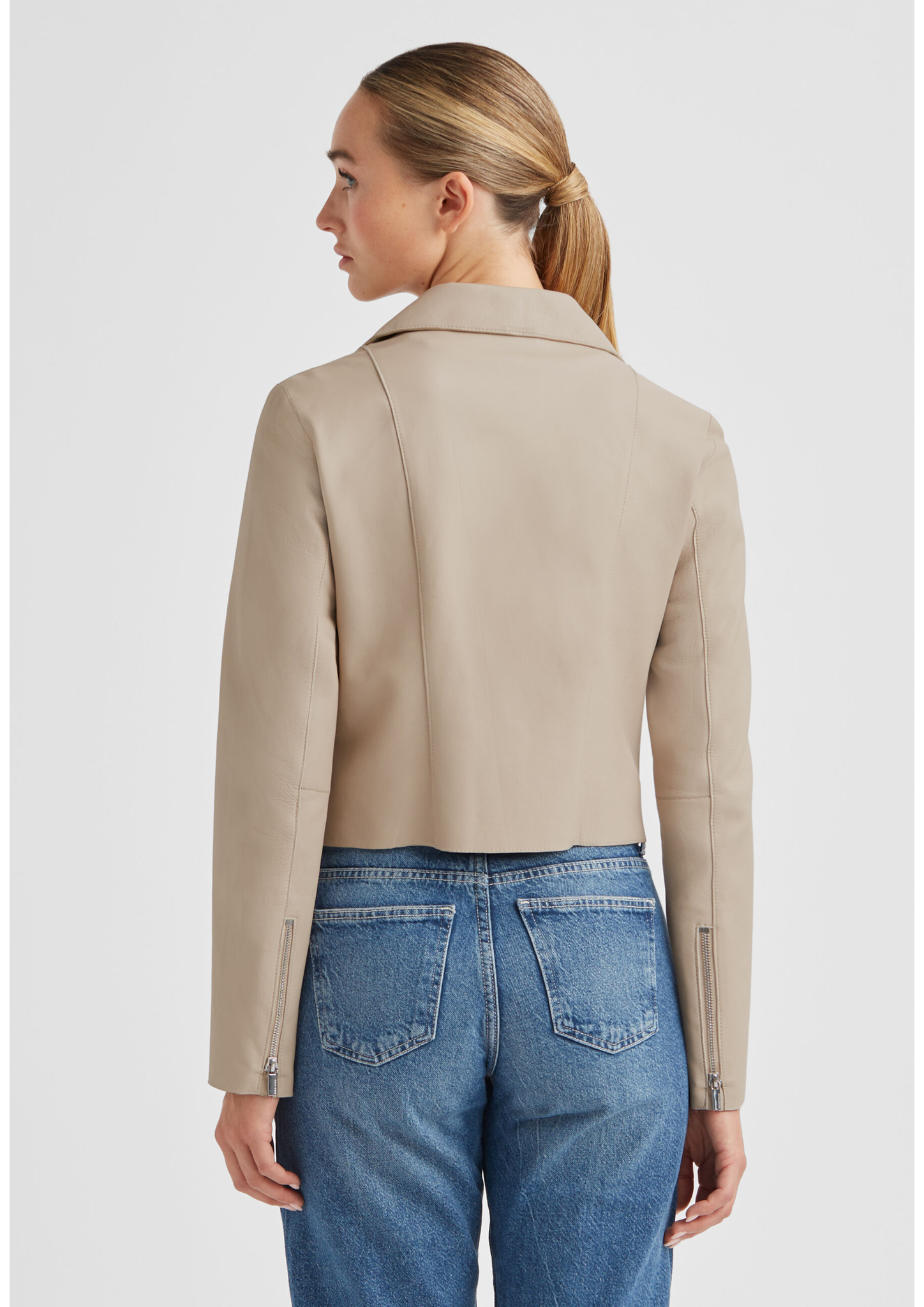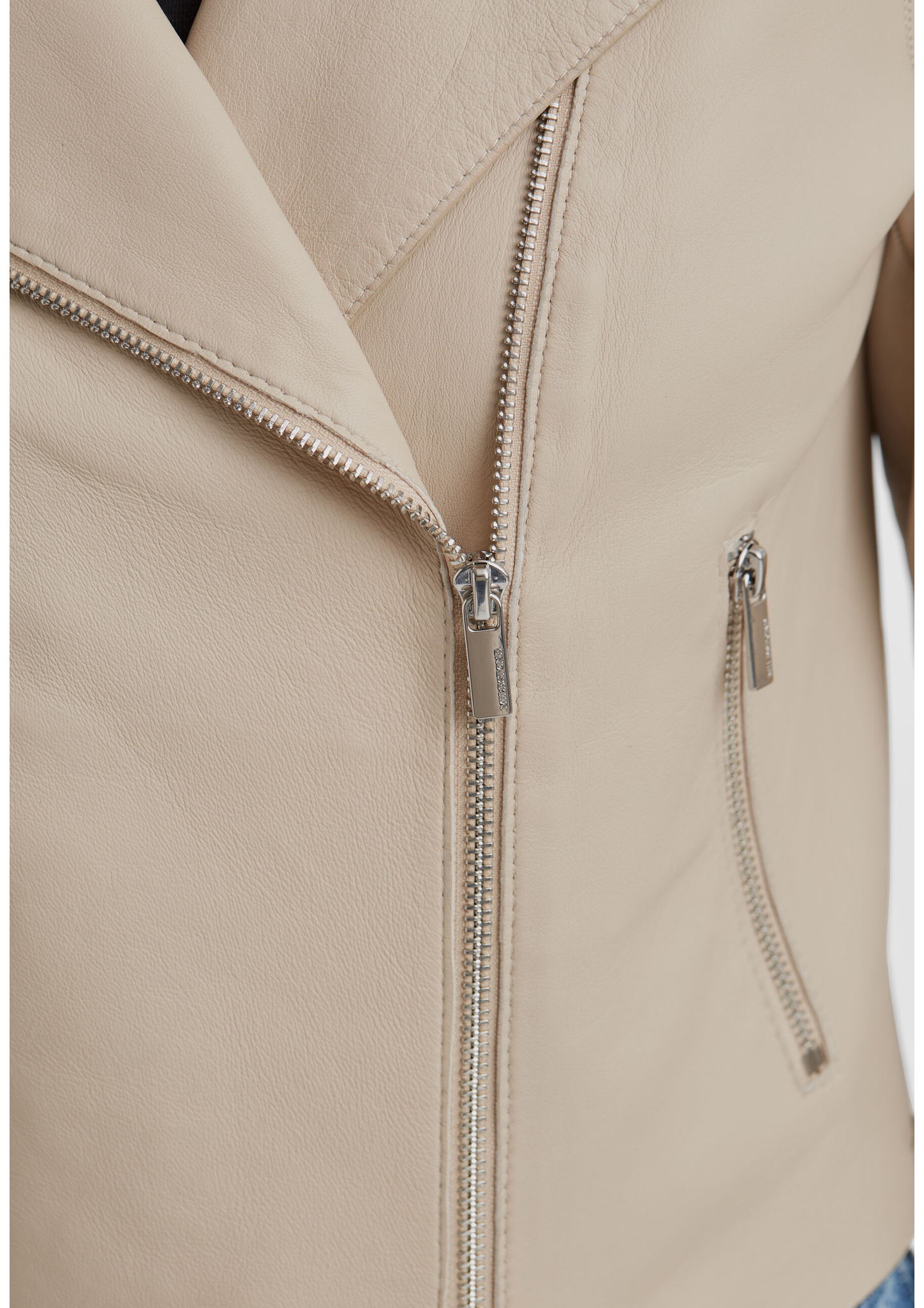 • Feines Lamm Nappa bondiert mit tonigem Lycra Jersey • Kurze diagonale Biker-Jacke mit Kragen • tailierte Passform (regular fit) • Sichtbarer 2-Wege-Metall-Reißverschluss • 2 Eingriffstaschen mit sichtbarem Metall-Reißverschluss • Ärmelschlitze mit sichtbarem Metall-Reißverschluss • Verarbeitung mit Pelznähten und Raw Edge Verarbeitung = Leichtigkeit • Kanten Verarbeitung mit Kontrastfarbe • Ungefüttert