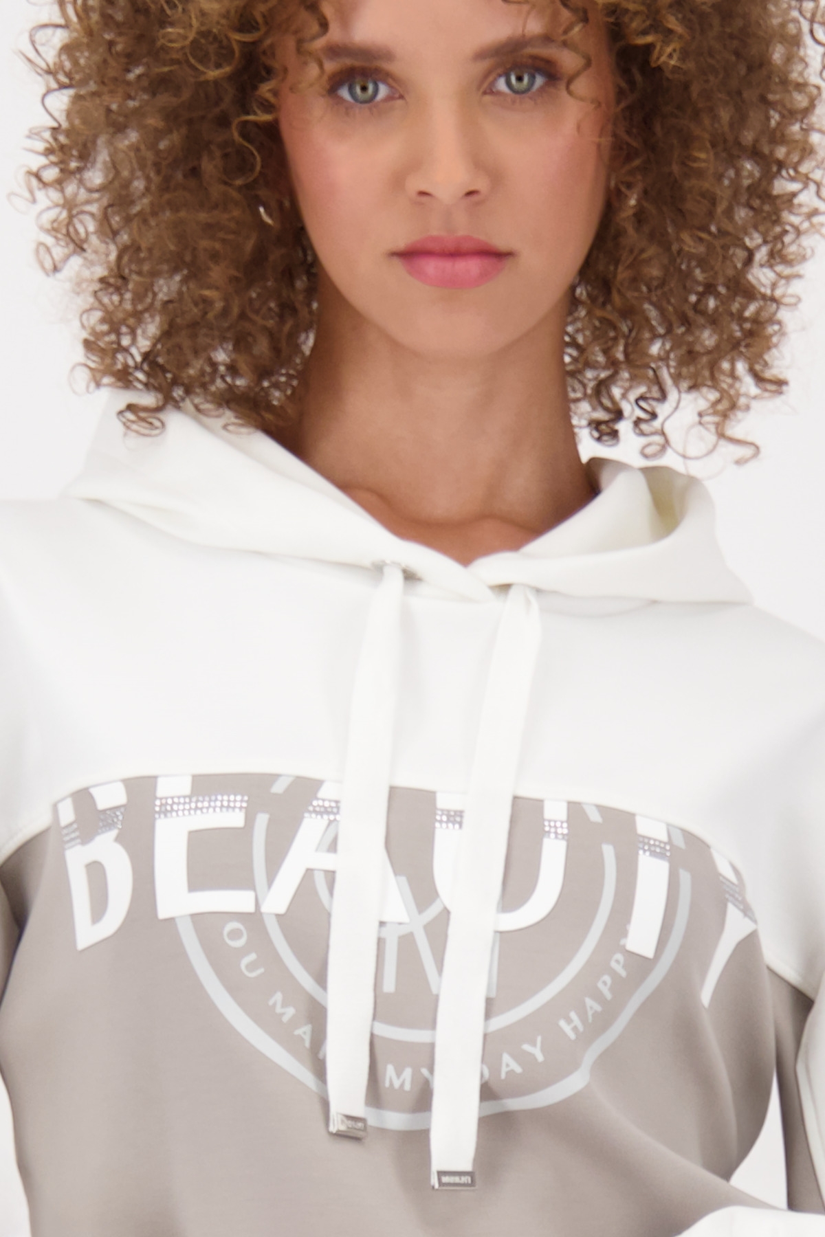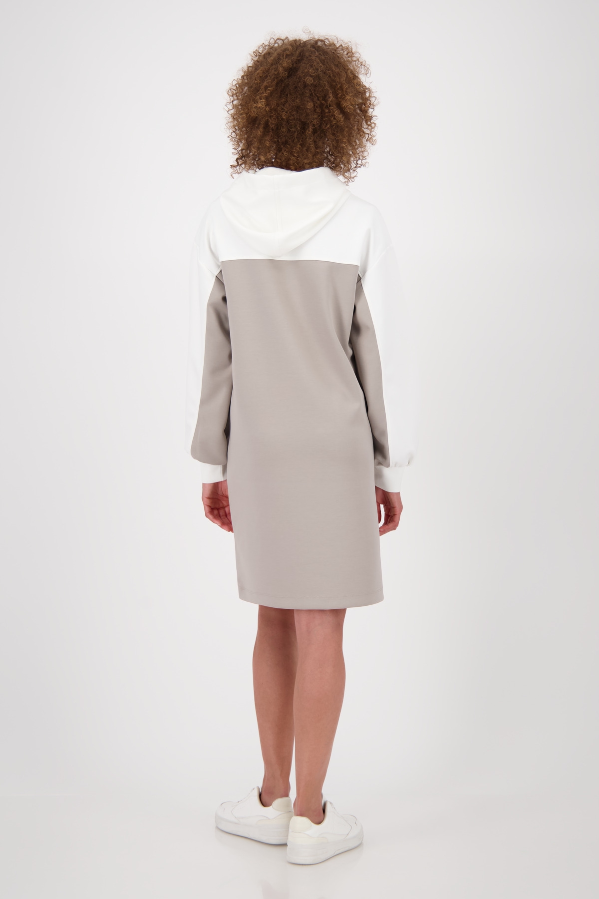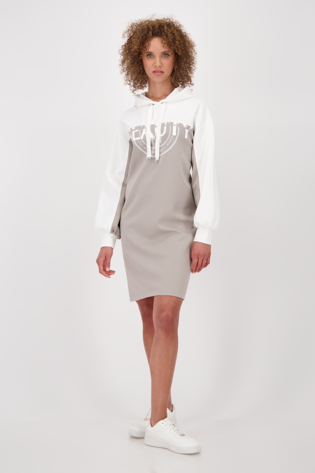 Dieses Kleid aus fließender Viskose und elastischem Material vereint Komfort mit modischem Statement. Der „Beauty“-Schriftzug mit funkelnden Strasssteinen und das trendige Colorblocking setzen stylische Akzente. Die Kapuze mit Bindeband rundet den sportlich-femininen Look perfekt ab – ideal für entspannte, dennoch auffällige Outfits.