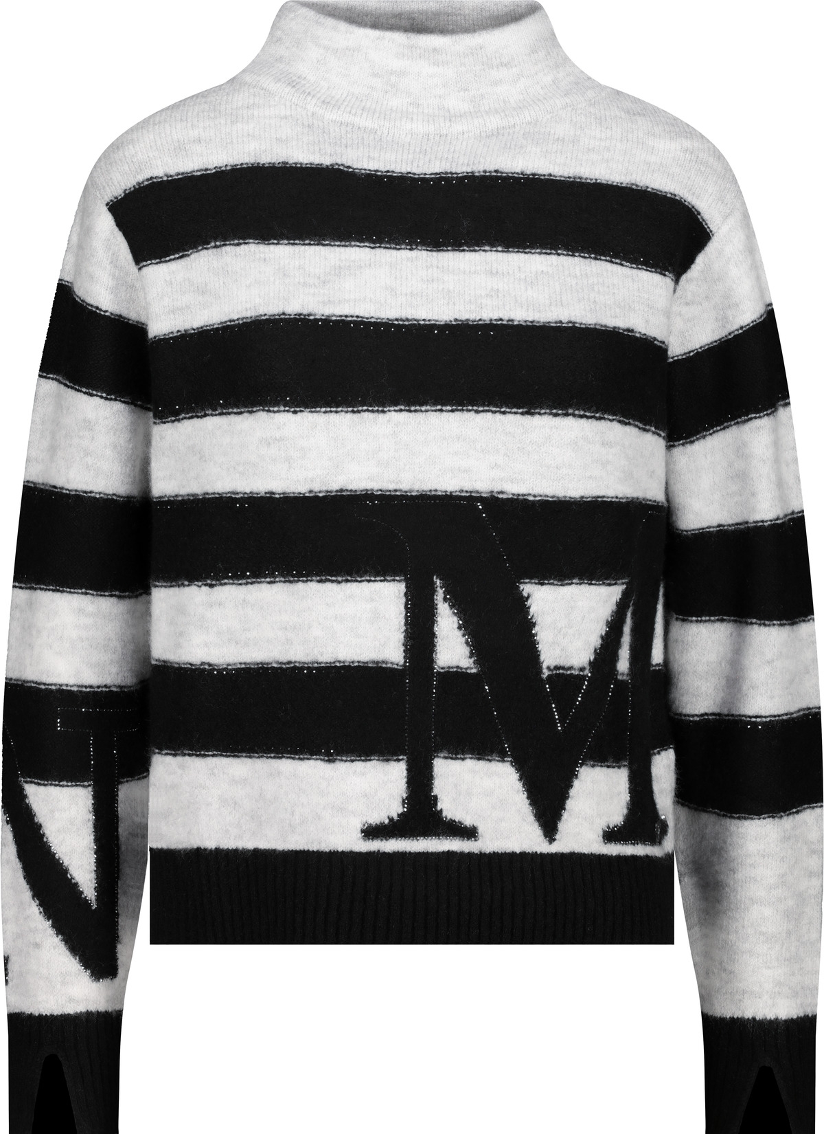 Eleganter Pullover aus fließender Viskose mit Ringelmuster, geschmückt mit Strasssteinen, Stehkragen und Intarsiemuster – ein Must-have!