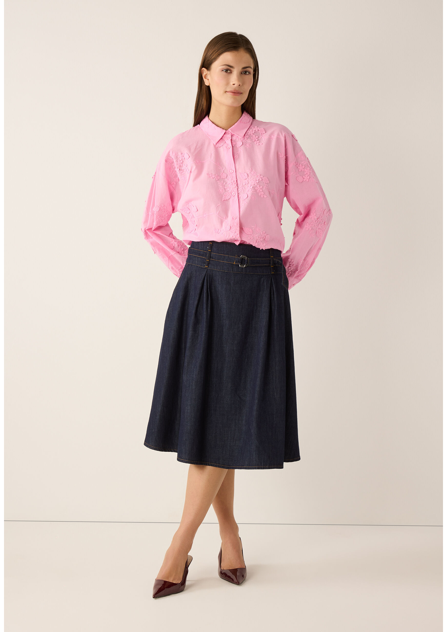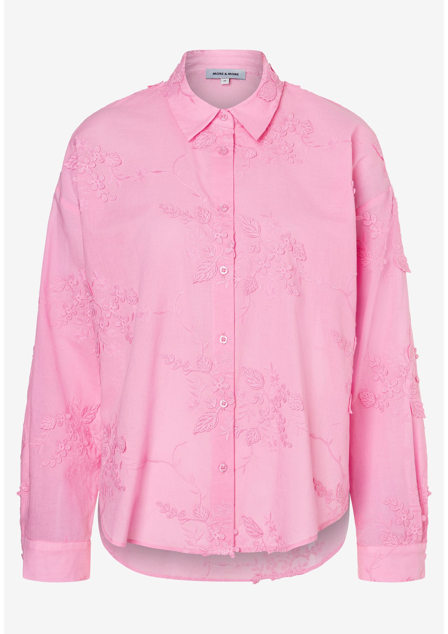 Die wunderschöne Bluse von MORE & MORE mit dekorativer Allover-Bestickung sieht mit verwaschener Jeans und Sneakers einfach super aus.
