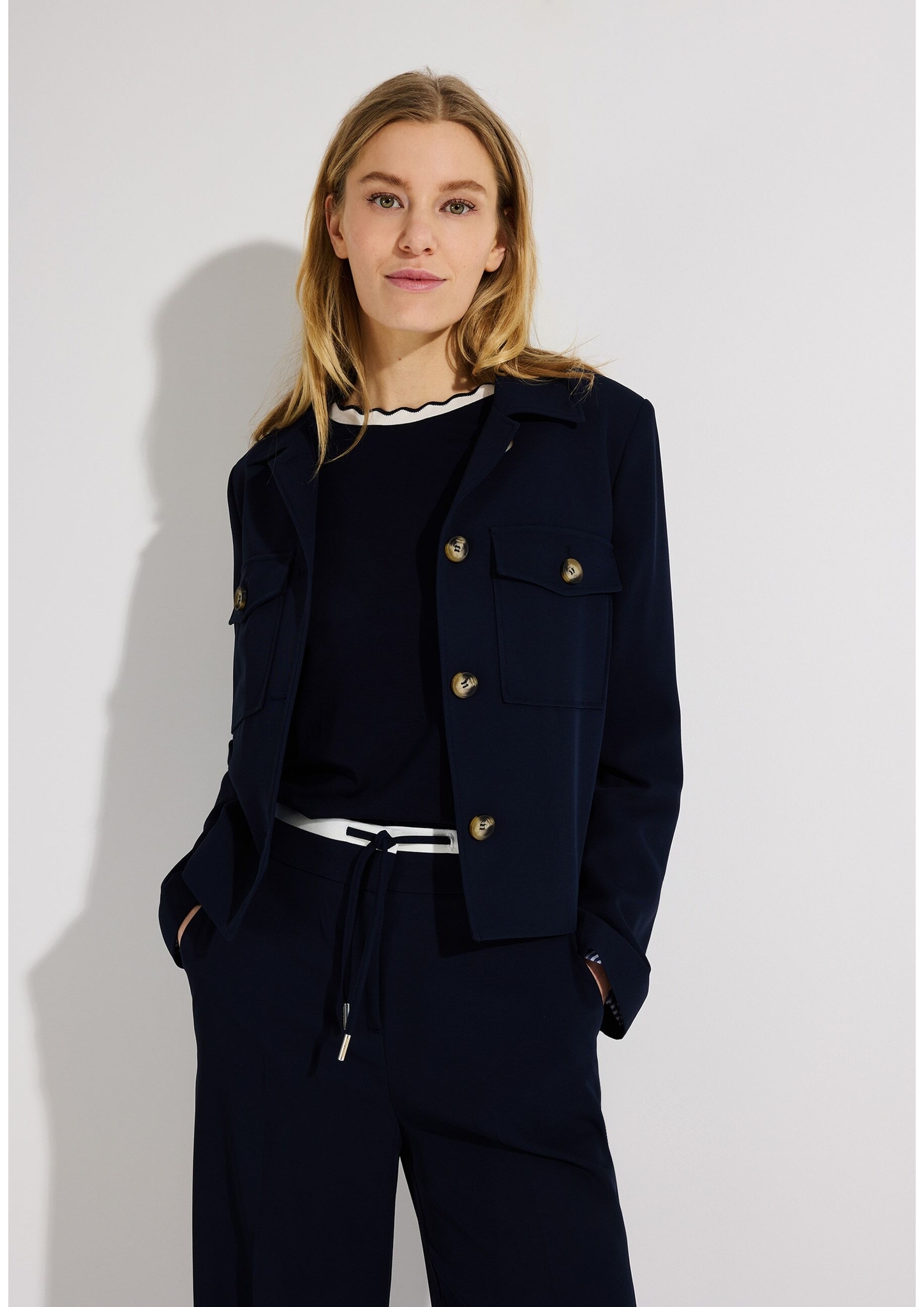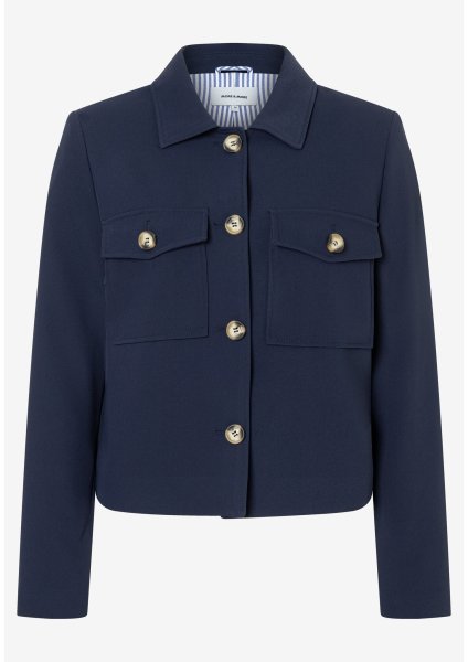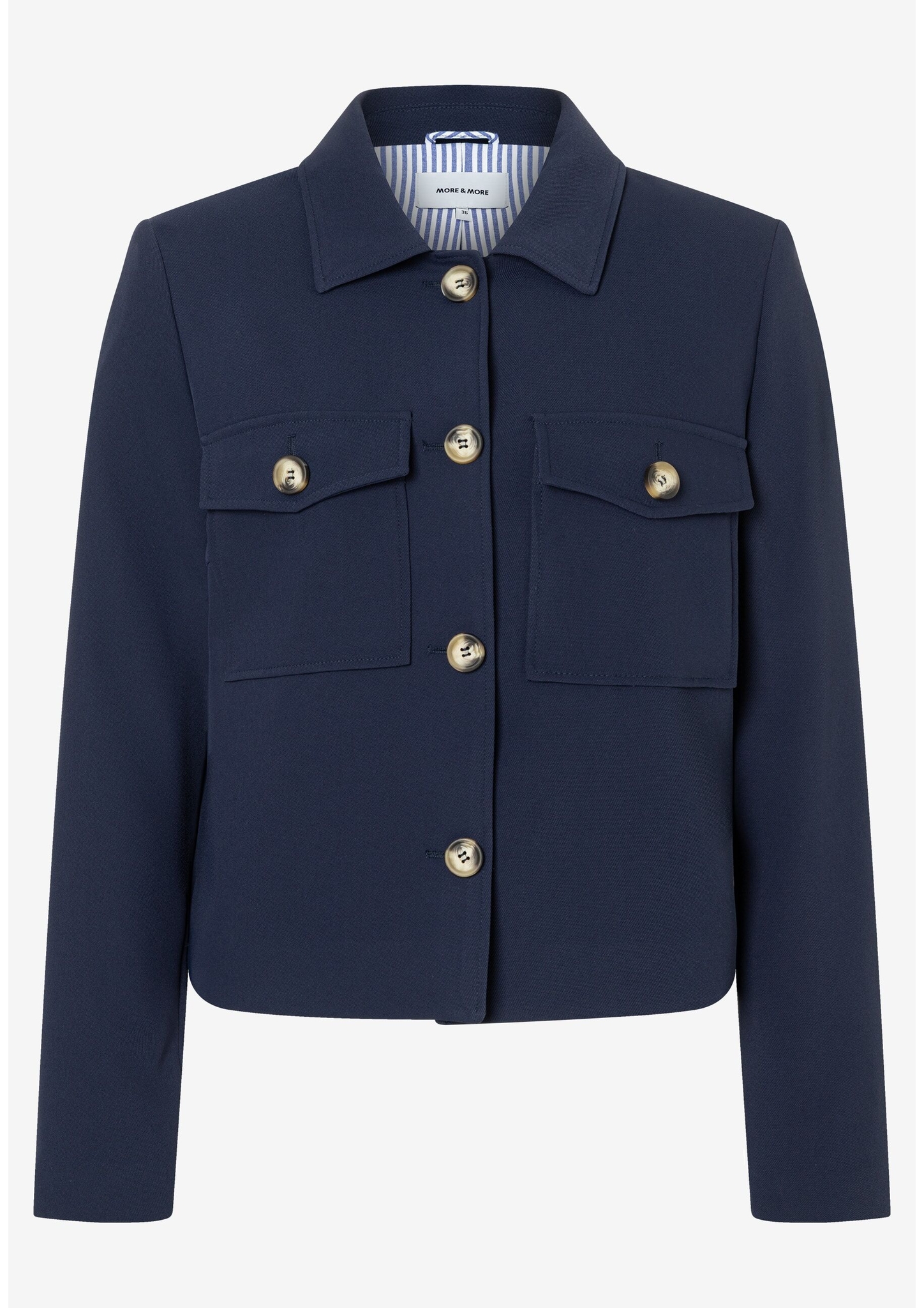 Die kurze, kastige Jacke von MORE & MORE mit dekorativem Streifenfutter wird mit passender Hose zum neuen, lässigen Business-Look. Sie kann aber auch ganz leger mit Jeans, Ringelshirt und Sneakers in der Freizeit getragen werden.